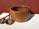 Description: Stave bonded teak. Salad bowl from Nissen and salad cutlery (The cutlery presumably designed by Jens Harald Quistgaard). Dimensions: Height 14 cm, Diameter 23 cm. Traces of wear especially on cutlery sets.