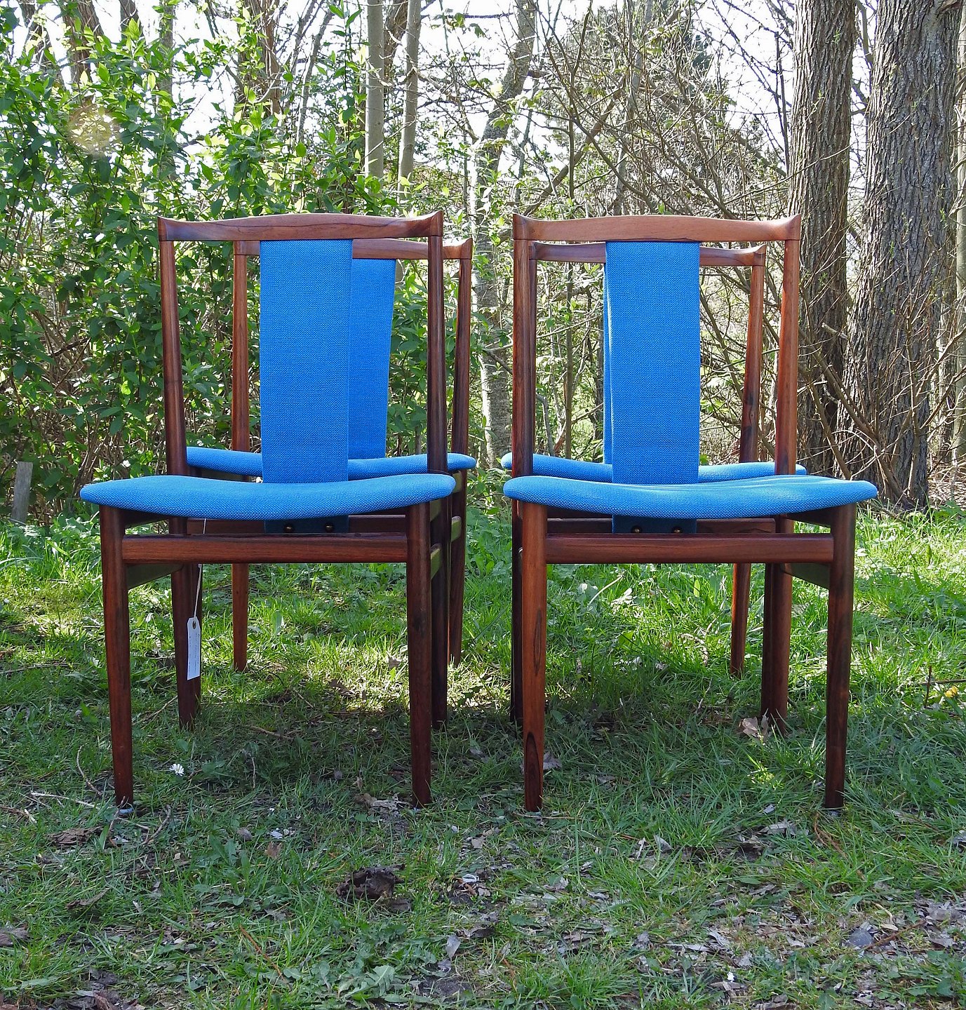 Beskrivelse: Et sæt på 4 stole i palisander med turkis stofbetræk på ryg og sæder