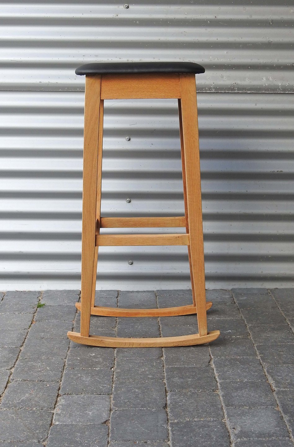 Beskrivelse: Barstol i eg med gyngeeffekt og med nypolstret sæde i sort læder