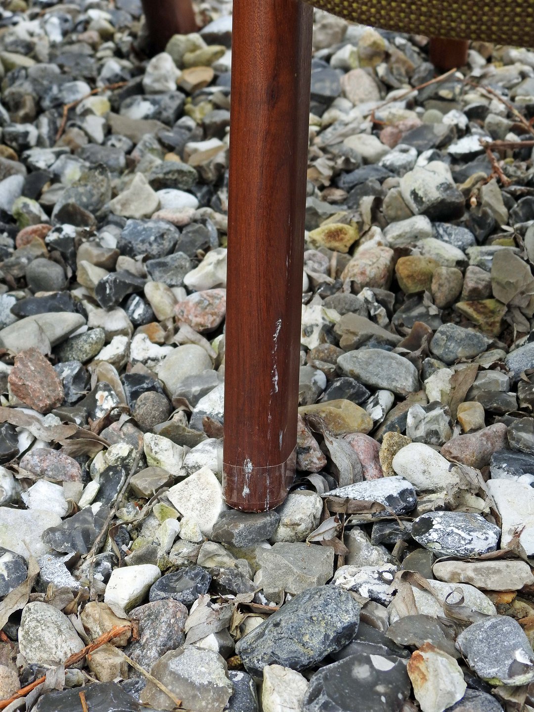 Beskrivelse: Et sæt lænestole med stel i teaktræ og polstret sæder i grønt og gyldent stof