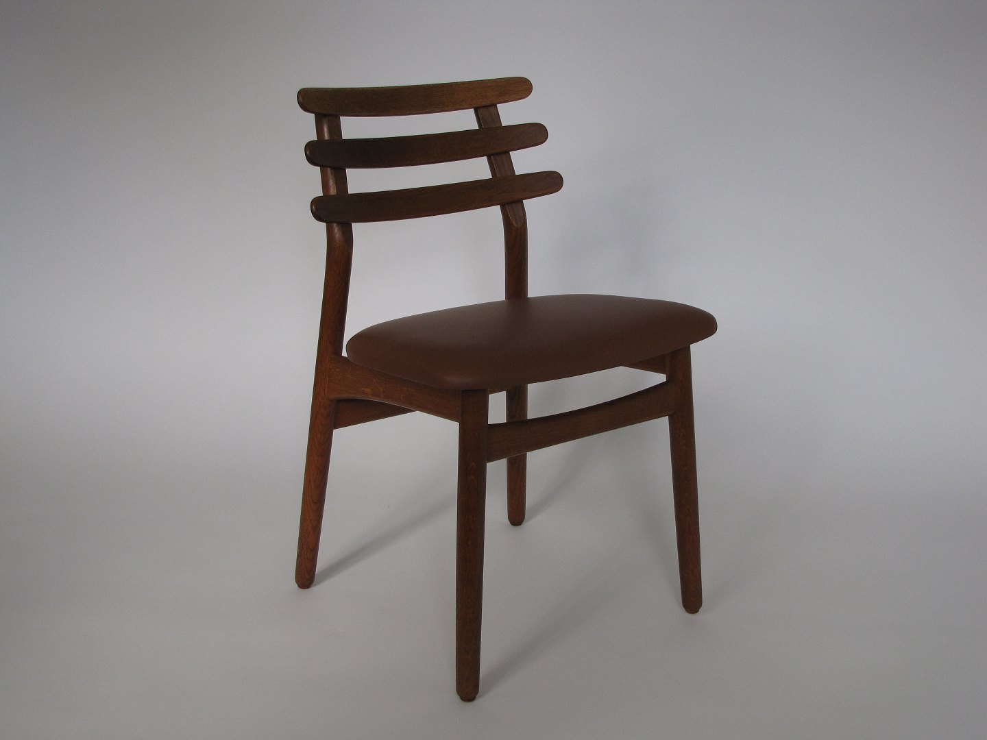 Beskrivelse: Poul M. Volther klassiker fra 1951. Spisestue stol af patineret egetræ. Betrukket med cognac farvet læder. FDB Model J 48.