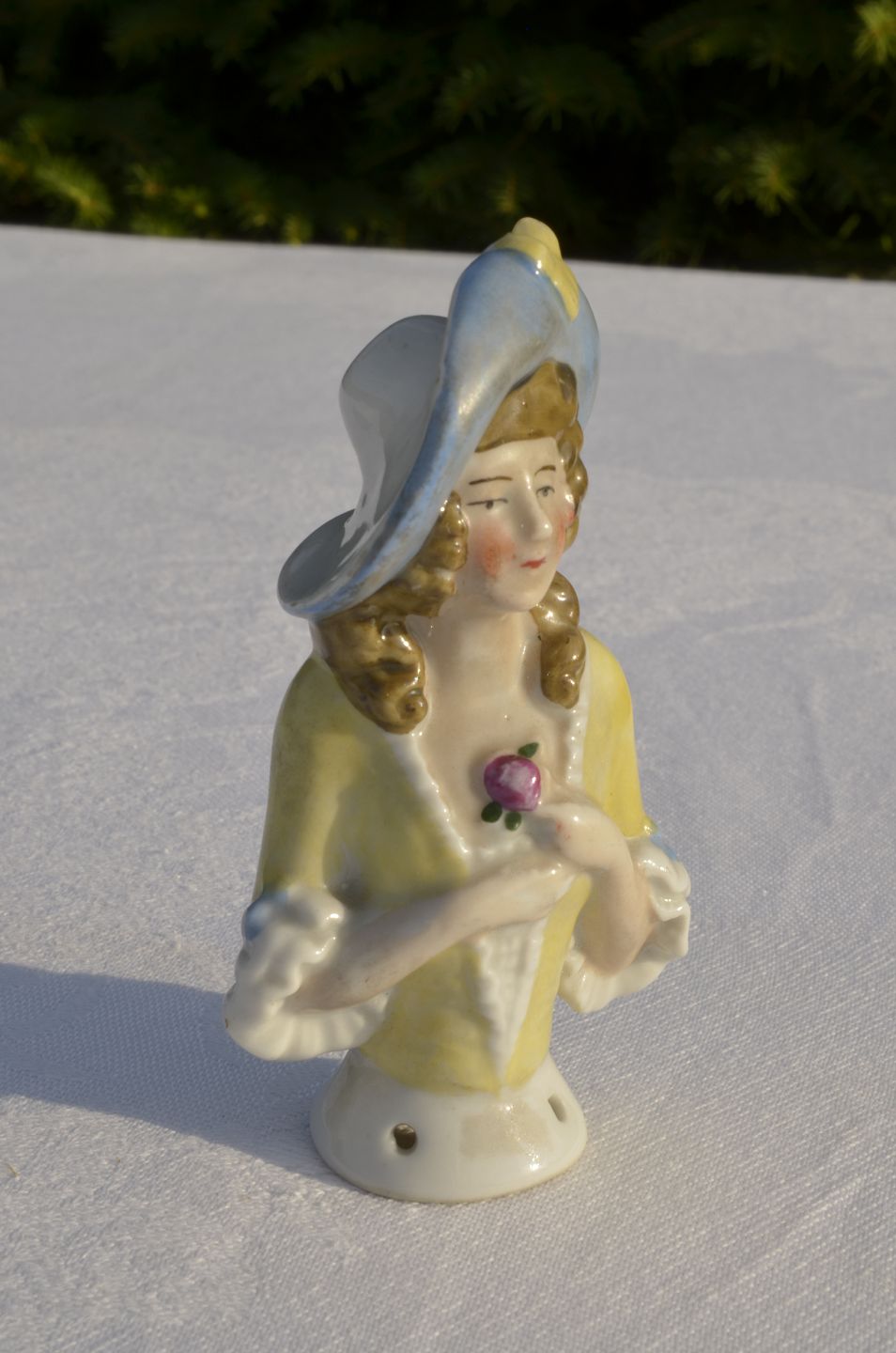 : Porcelain figurine. Half pin cushioon doll, Height 9 cm. 3 9/16 inches. Fine condition.