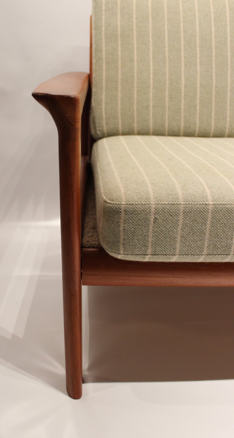 Trepersoners sofa af teak og hynder polstret i lysegrønt uldstof af Svend Ellekær fra 1970erne.