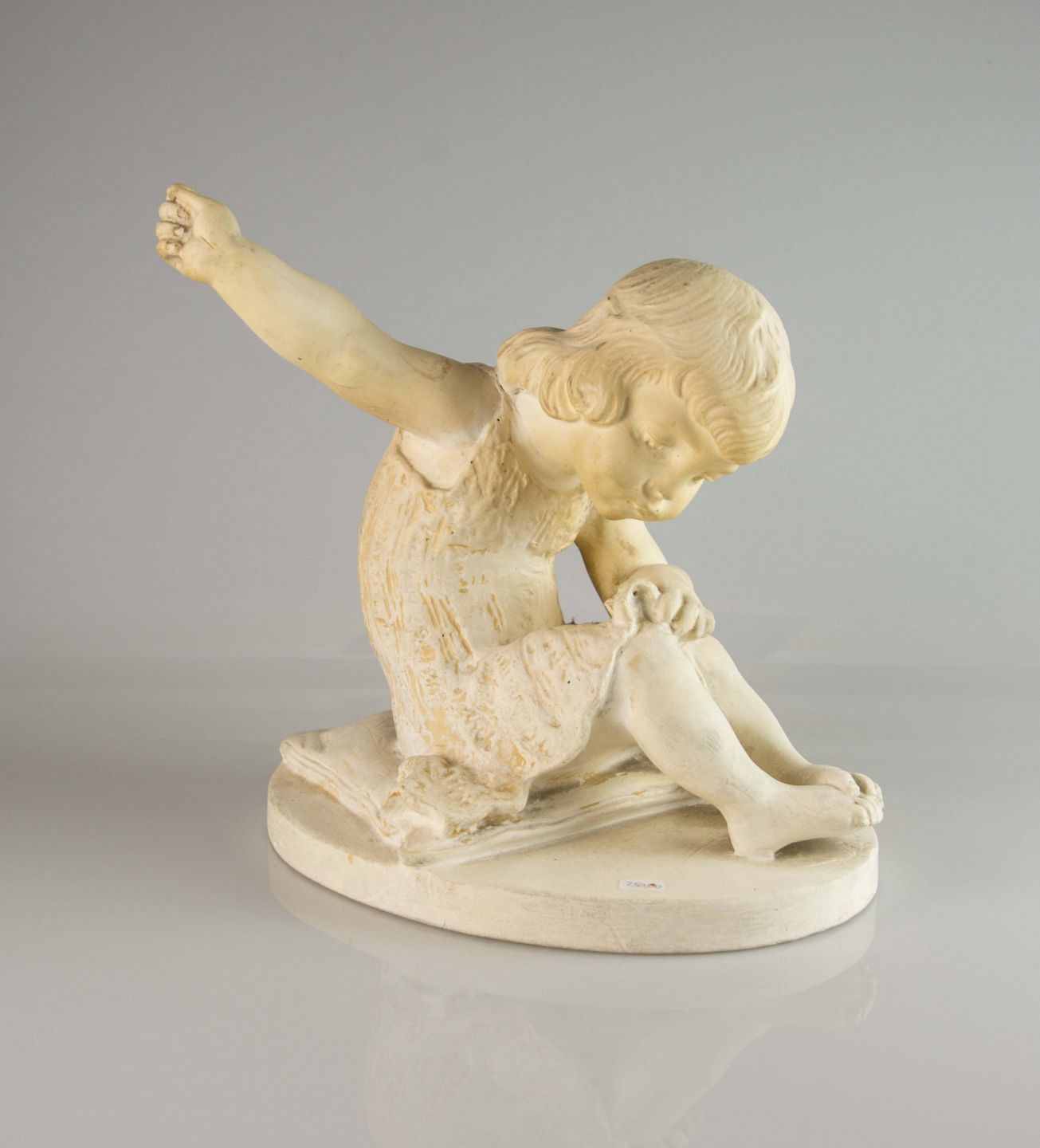 Beskrivelse: Figur i keramik med motiv af siddende pige som syr