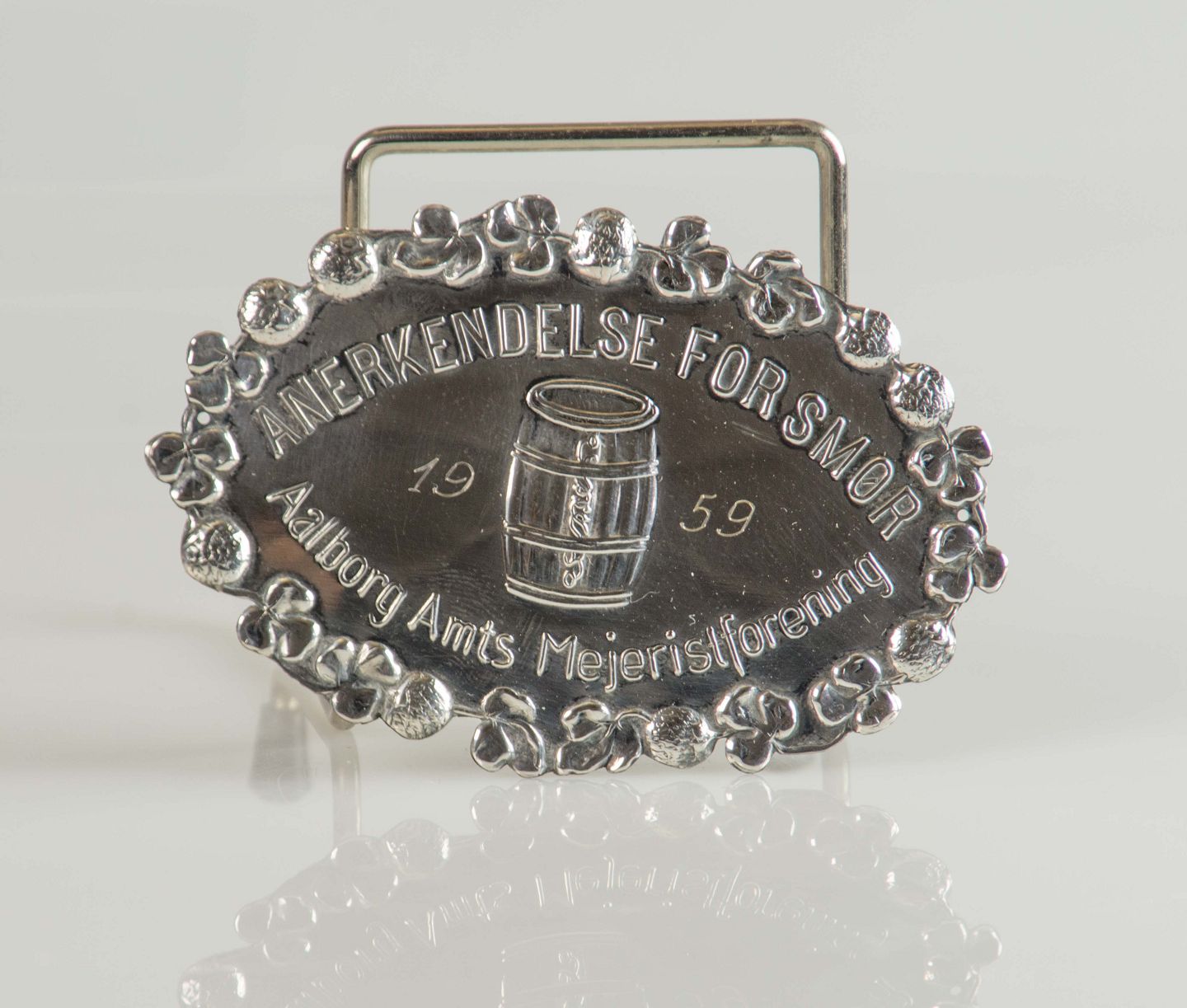 Beskrivelse: Sølv skilt, anerkendelse for smør af Aalborg Amts mejeriforening 1959