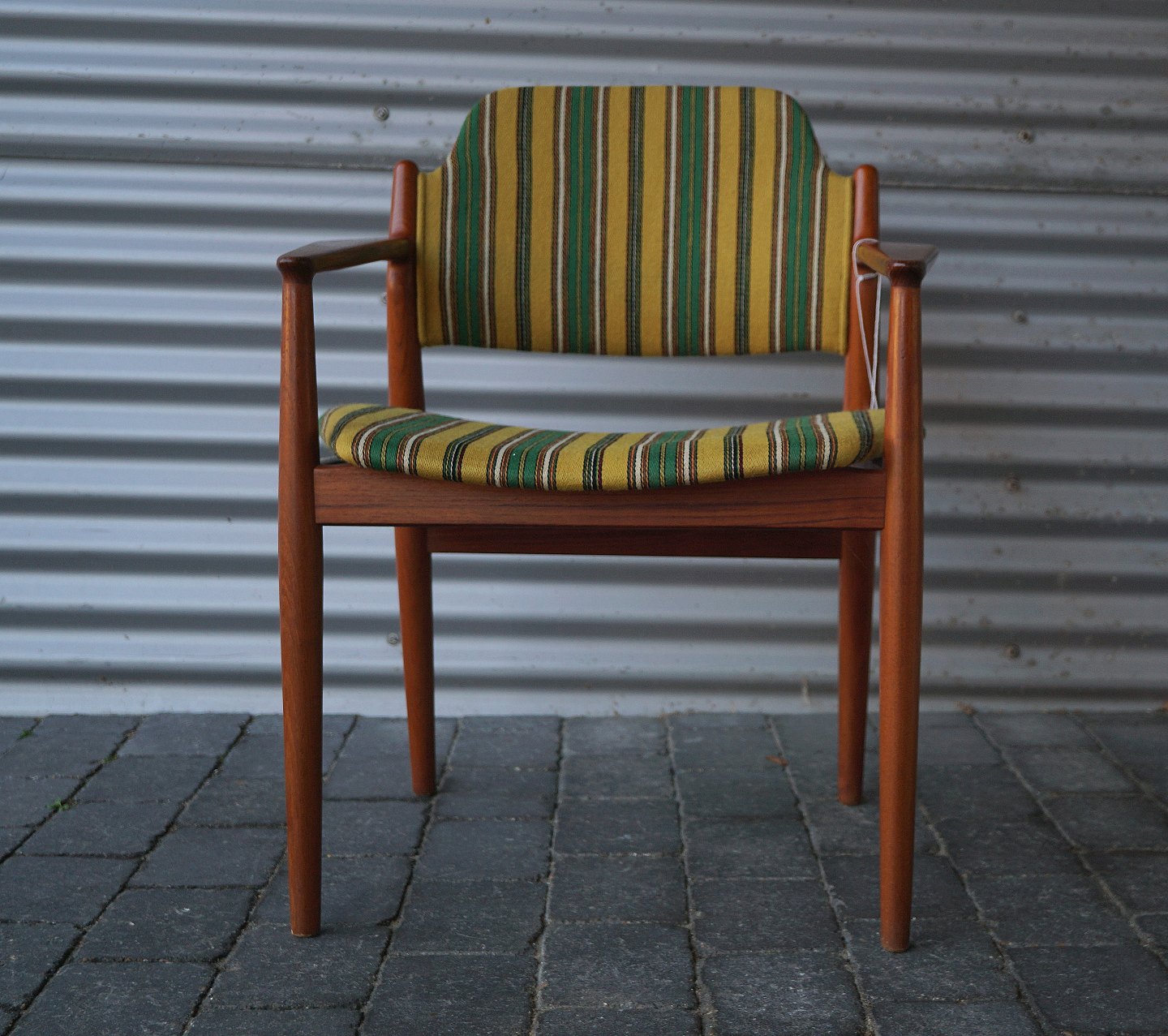 Beskrivelse: Arne Wooder, armstol betrukket med originalt stribet stof, stolen er lavet i teaktræ
