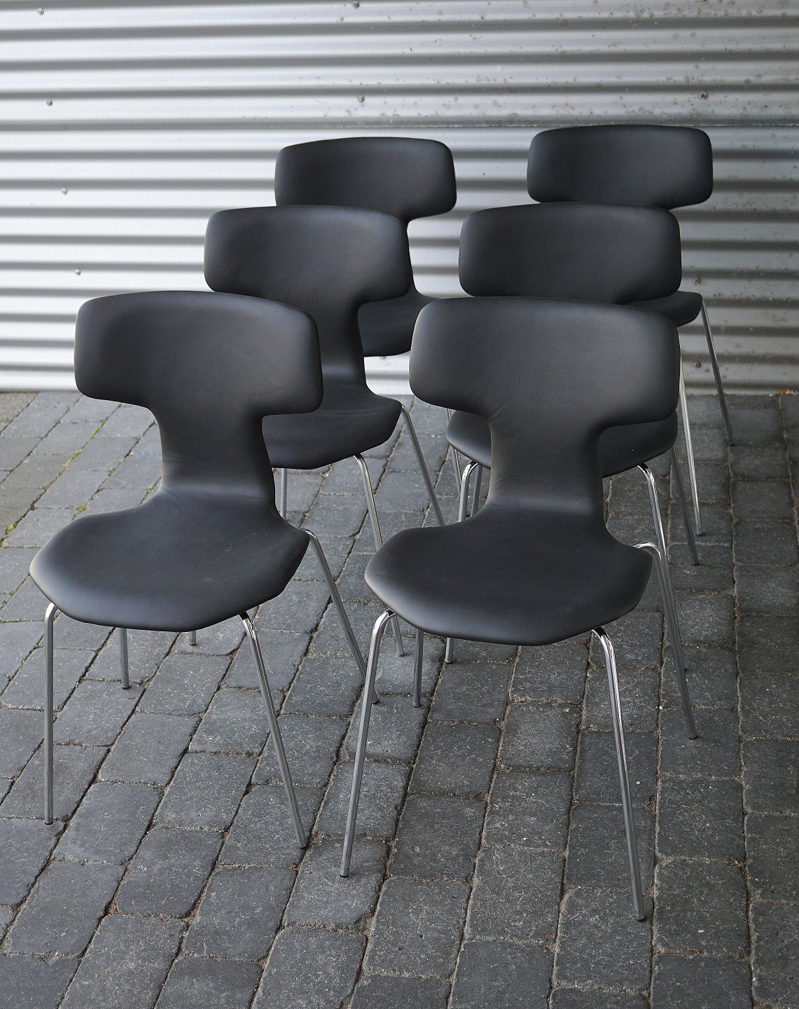 Beskrivelse: Arne Jacobsen, 6 styk T-stole spisebordsstole. Stolene er ombetrukket med sort læder af klassisk kvalitet.