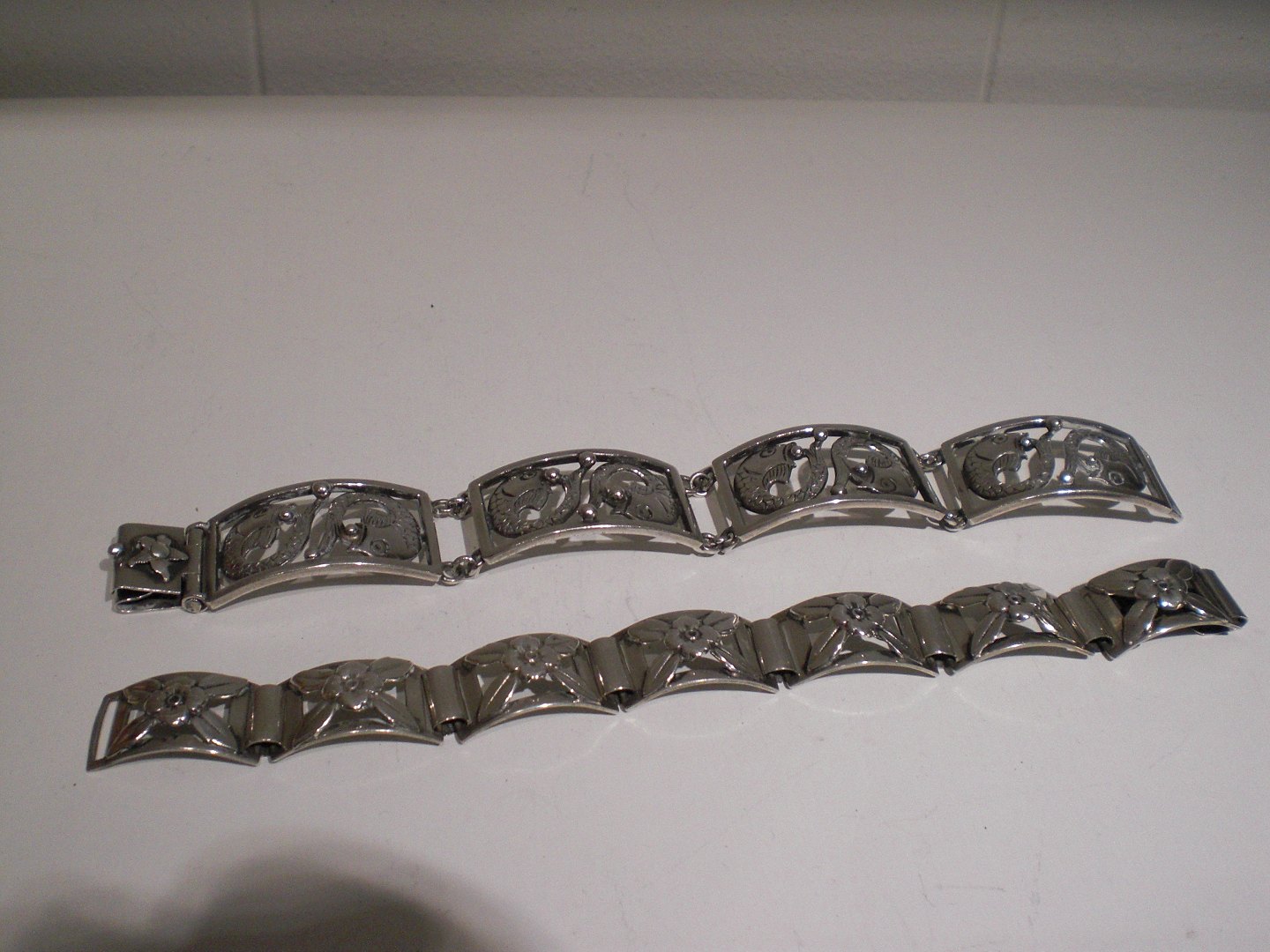 Til højre: Armbånd i 830 sølv udført af CBH = C. Brumberg Hansen, Kbh. (1937 - 1950) Ca. 1945. Vægt: 20,3 gram. Længde: 18,2 cm - bredde: 1,5 cm. I pæn stand med let brugsslid. Solgt.