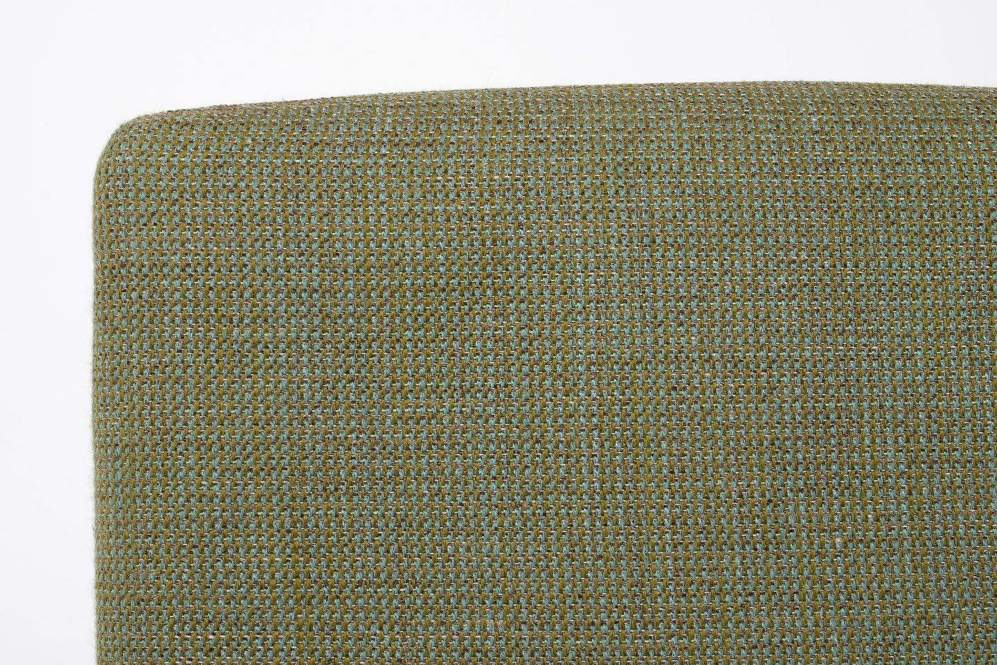 Lænestol med frisvingerstel i forkromet stål, betrukket i grøn uld og armlæn med sort læder
