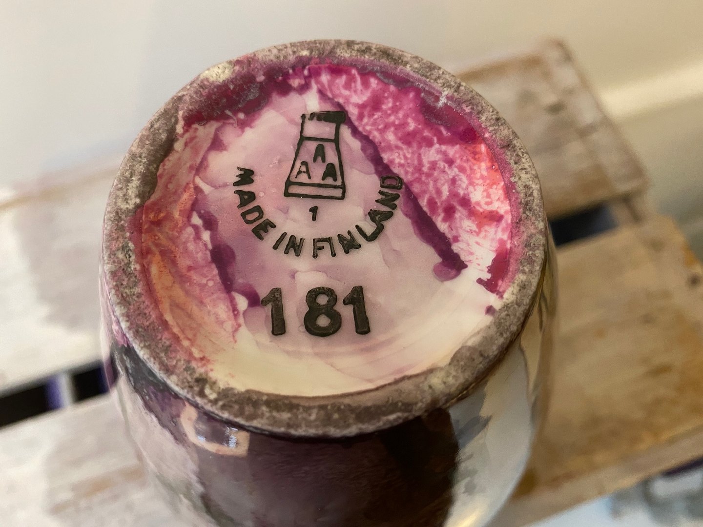 Beskrivelse: Smuk lilla Art Deco vase fra finske Arabia. Vasen er dækket af en flot marmoreret lustreglasur. Mærket viser, at vasen er lavet i 1920erne eller 1930erne i Finland og har form nr. 180. Et lille område er ikke dækket helt af glasuren - se foto med rød cirkel. Ellers rigtig god stand.