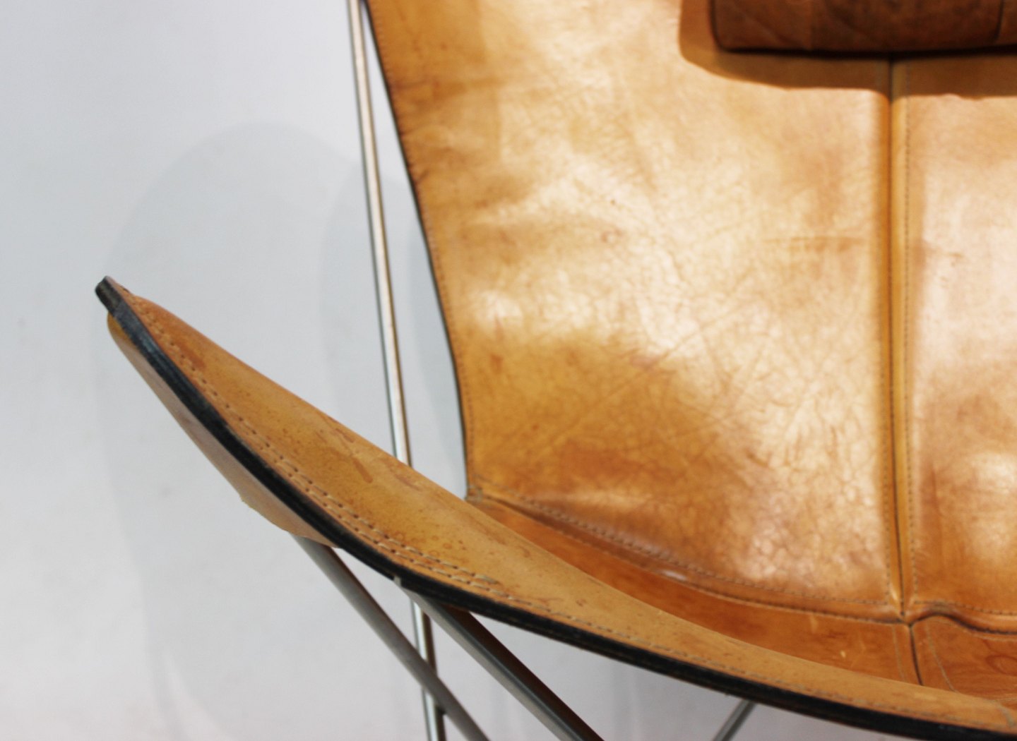 Beskrivelse: Flagermusstolen, KS chair, med nakkepude designet af Dennis Marquart og fremstillet af OX Denmarq. Stolen er af patineret cognac læder og er i flot brugt stand.