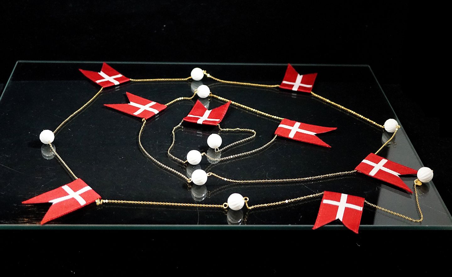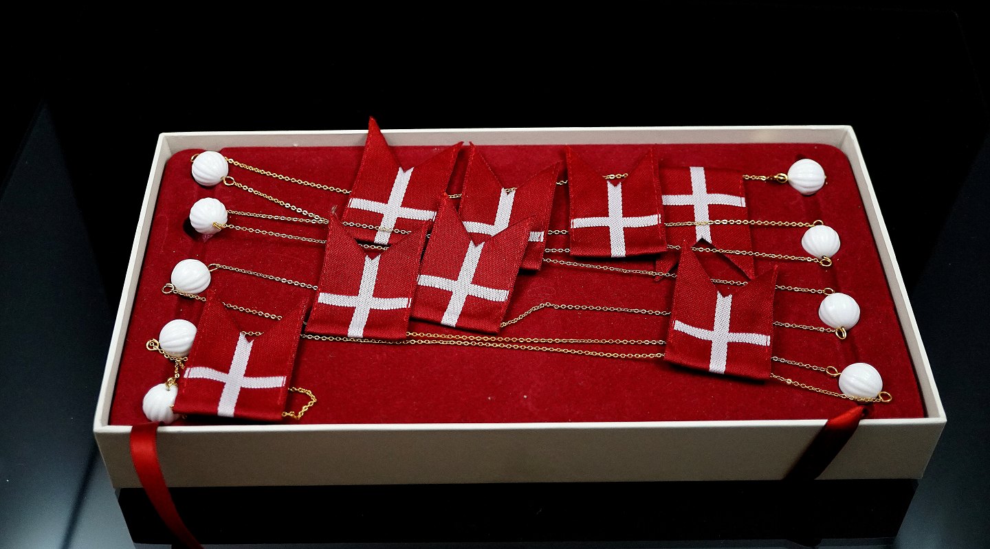 Beskrivelse: Royal Copenhagen. Flagranke med hvide porcelæns kugler og vævet Dannebrogs flag. Kæden er 24 karat forgyldt. Kæden er i original æske