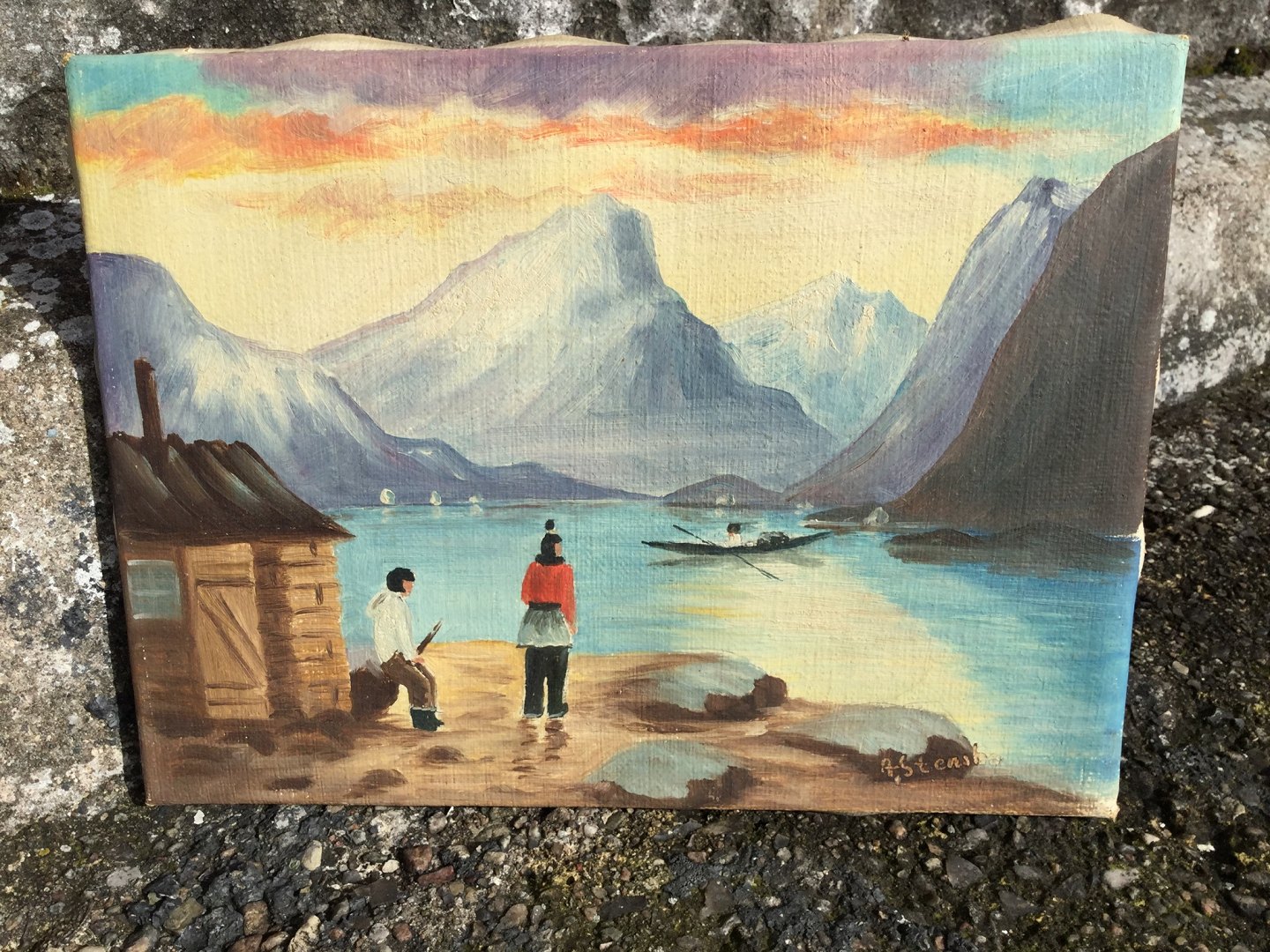 Beskrivelse: A. Stensbo, motiv fra Grønland. Lille olimaleri på lærred, fremstår uden ramme og med enkelte småpletter. Mål: 23x31 cm