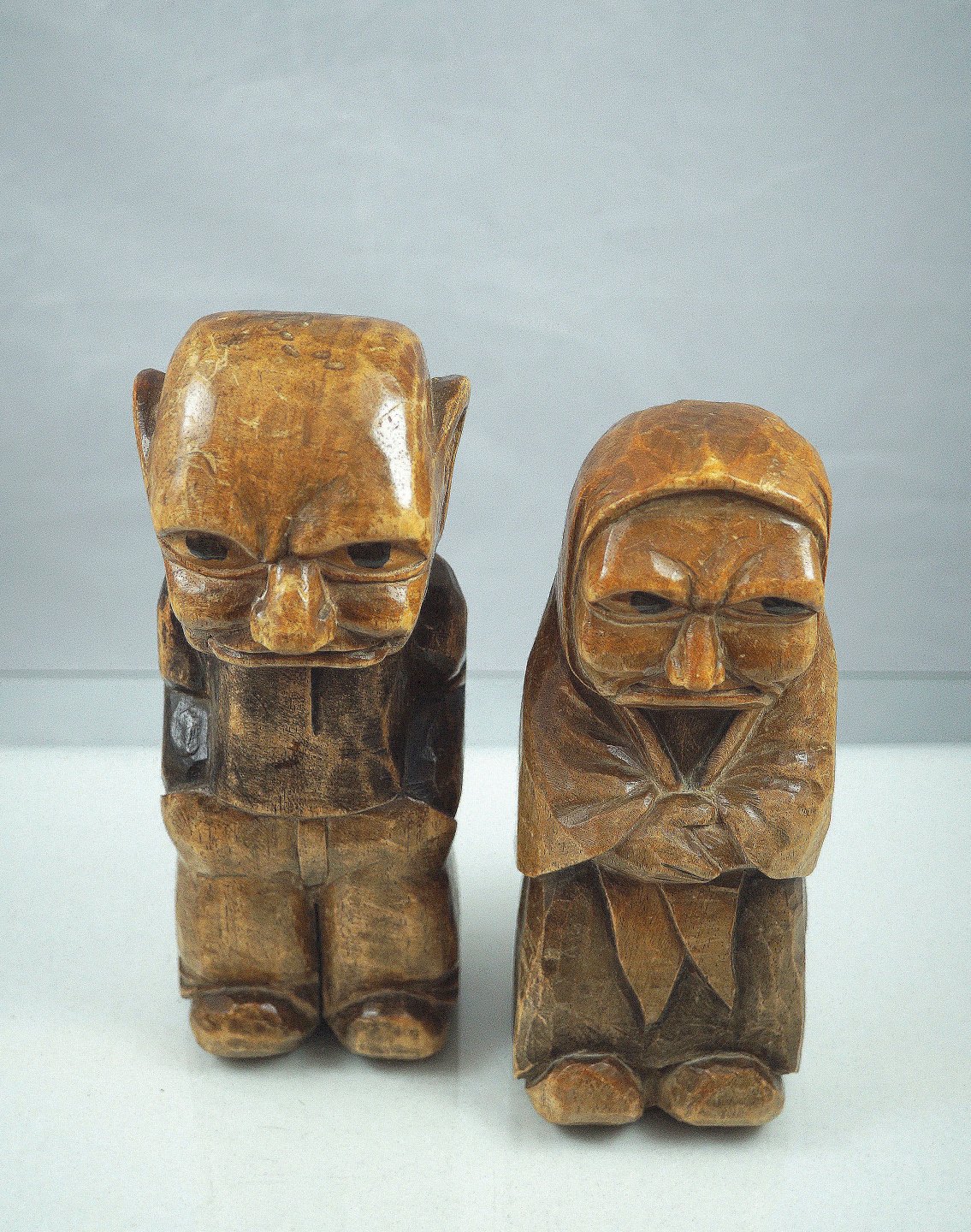 Beskrivelse: Håndsnittet DAM figurer. Figurerne er en gammel mand og en gammel kone. Manden har bukser og skjorte på, konen har kjole og tørklæde på, figurene er meget detaljeret