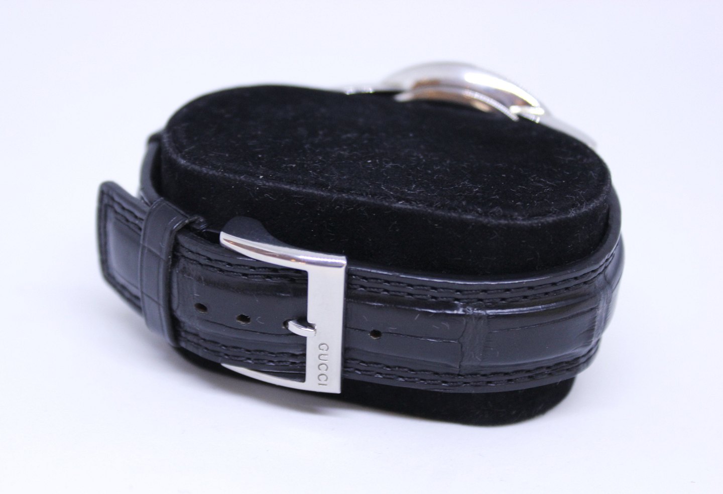 Gucci Timepieces model 5600M armbåndsur med sort læderrem og af rustfrit stål.