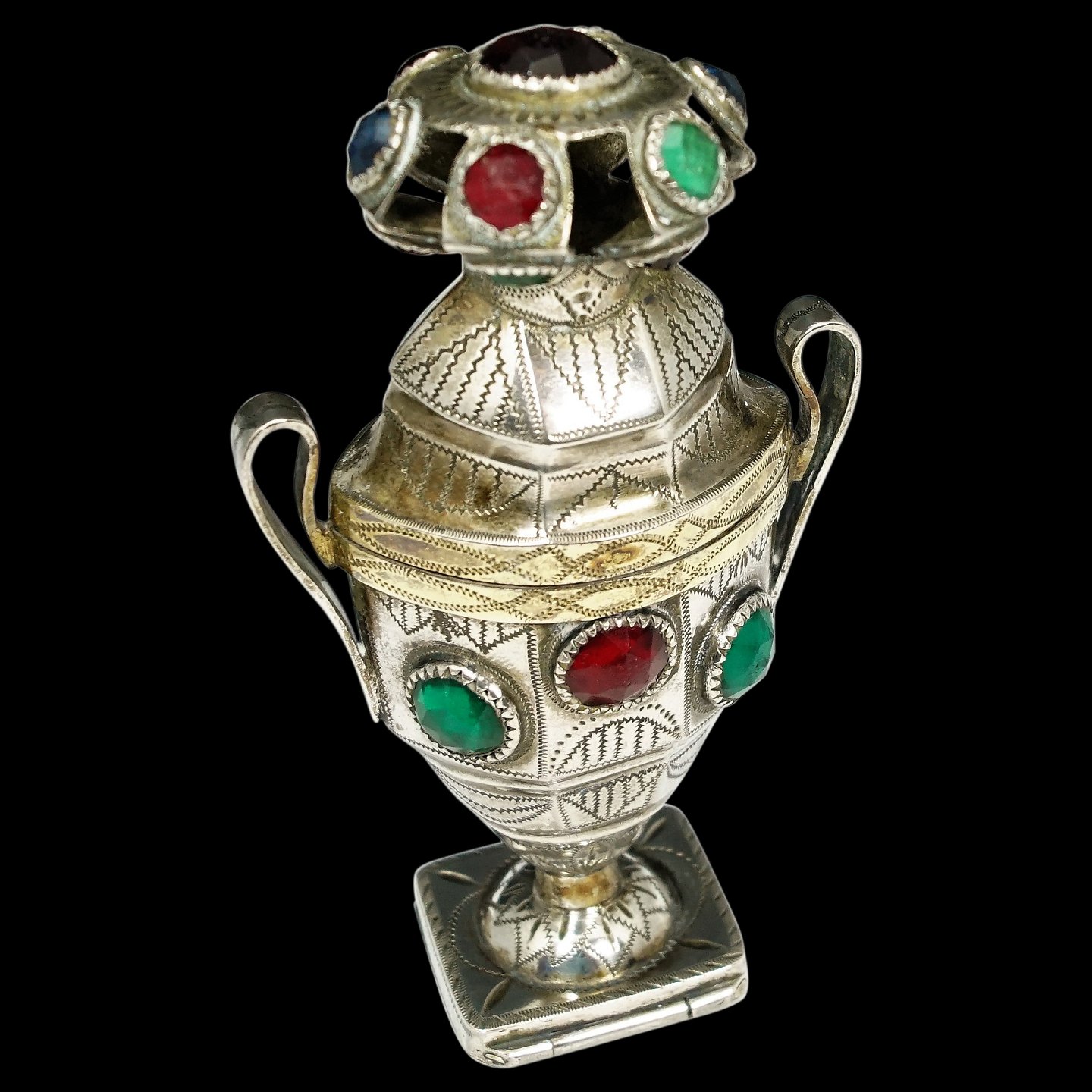 Sønderjysk hovedvandsæg af delvist forgyldt sølv, indvendigt forgyldt, prydet med 19 røde, blå og grønne flusser, top med gennembrudt krone, firkantet fodstykke med balsamgemme. Punslet 1847. H. 11 cm.