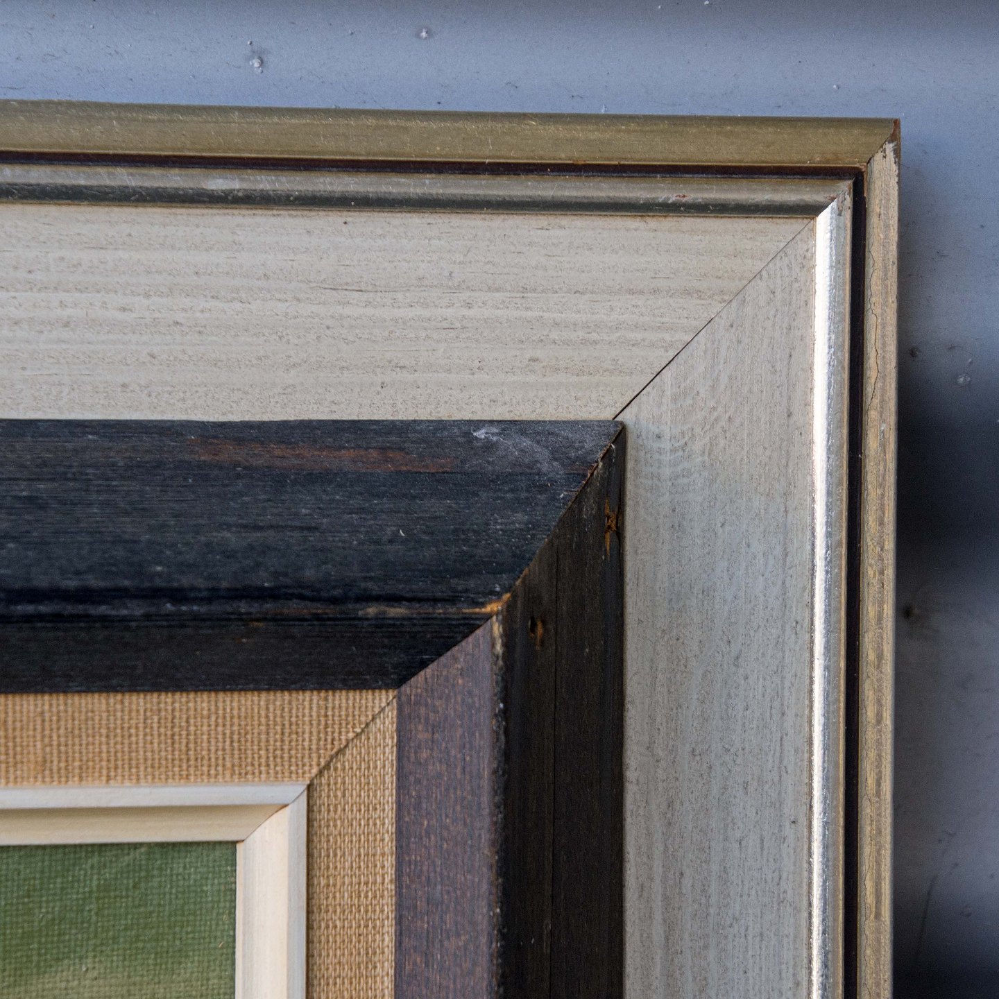 Beskrivelse: Maleri af skov i sne, med solnedgang. Olie på lærred i ramme.