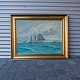 Beskrivelse: Maleri af 3 master sejlskib på hav, olie på lærred med guldramme