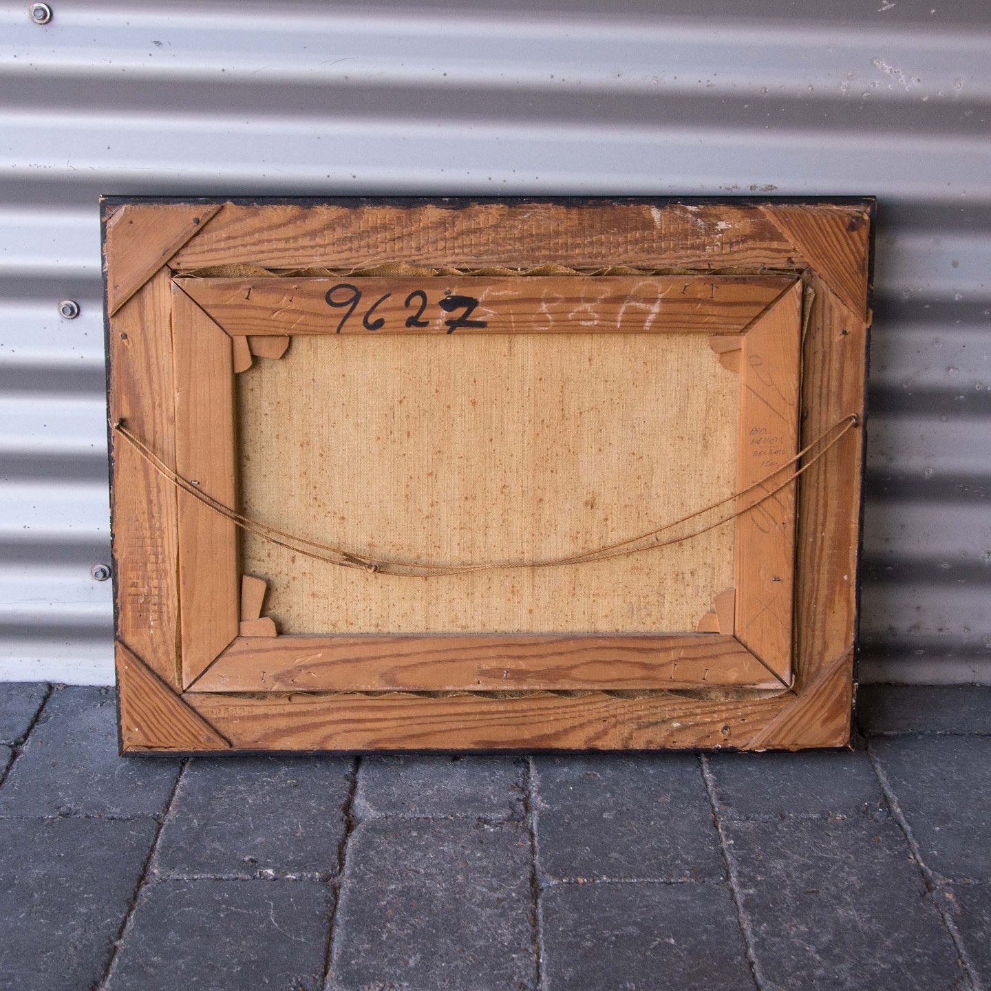 Beskrivelse: Landskabmaleri med vintermotiv af hus i naturomgivelser