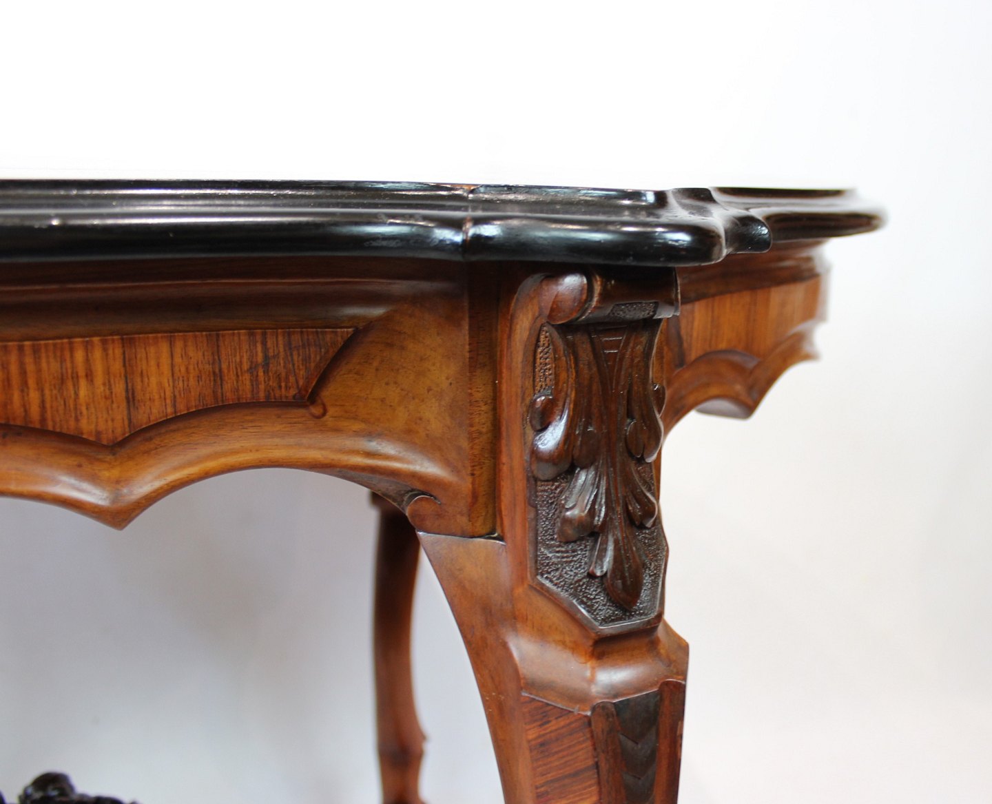 New Rococo pedestal table of walnut with carvings and inlaid intarsia of fruit wood from the 1880s.