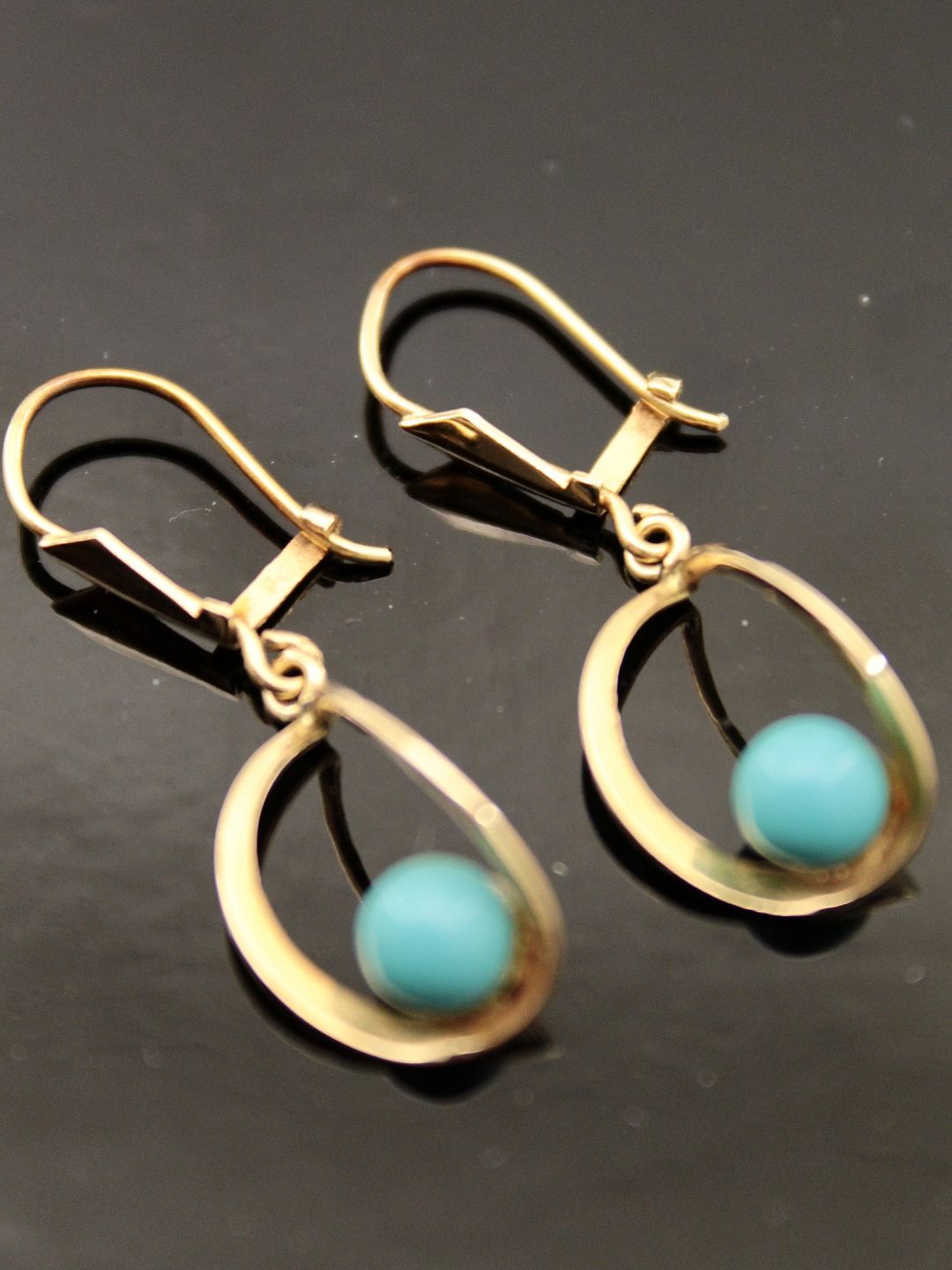 Beskrivelse: 14 karat guld øreringe L. 3,2 cm. med turkis kugle fra guldsmed Volmer Bahner Farum Nr. 417735