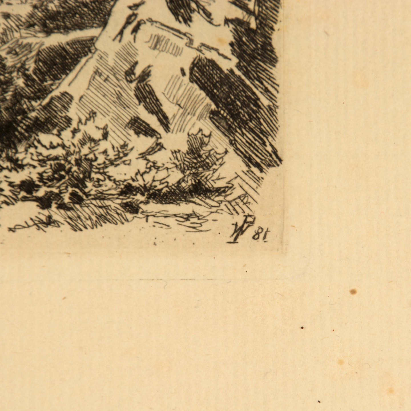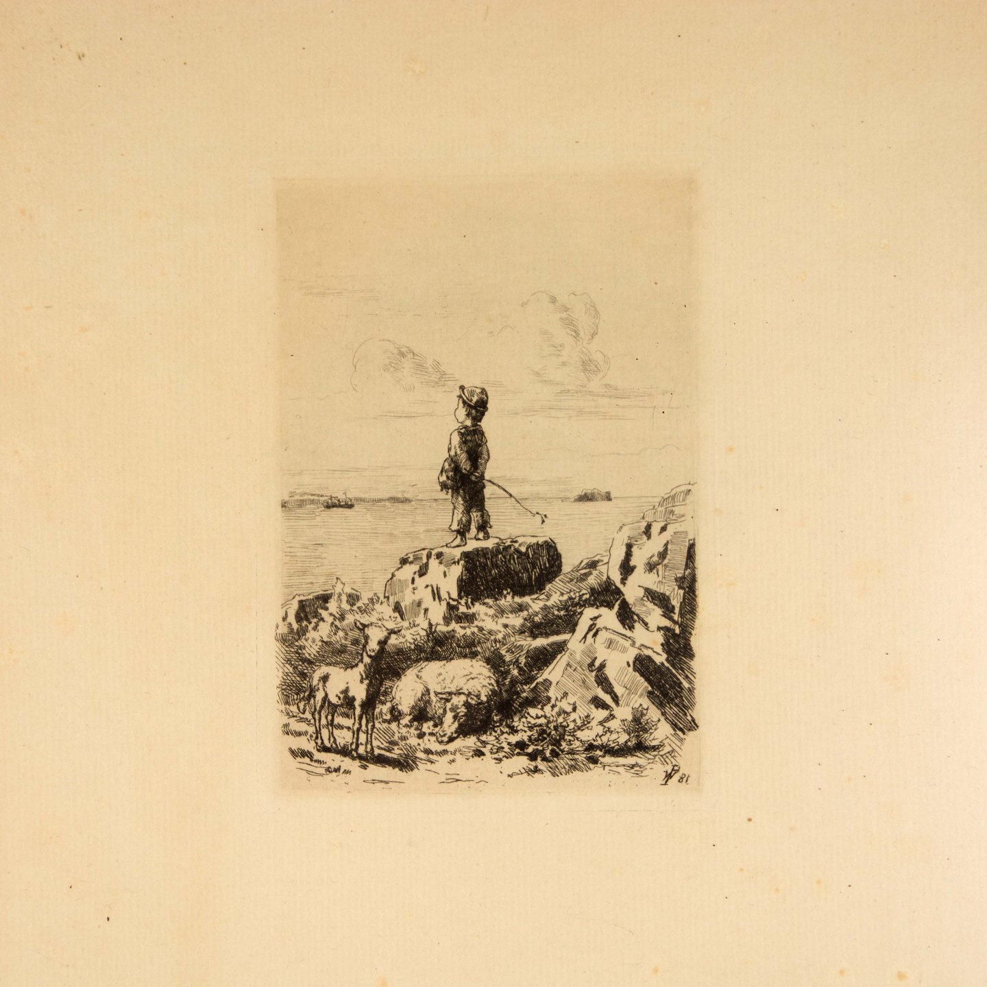 Beskrivelse: Radering med motiv af en lille dreng og ged