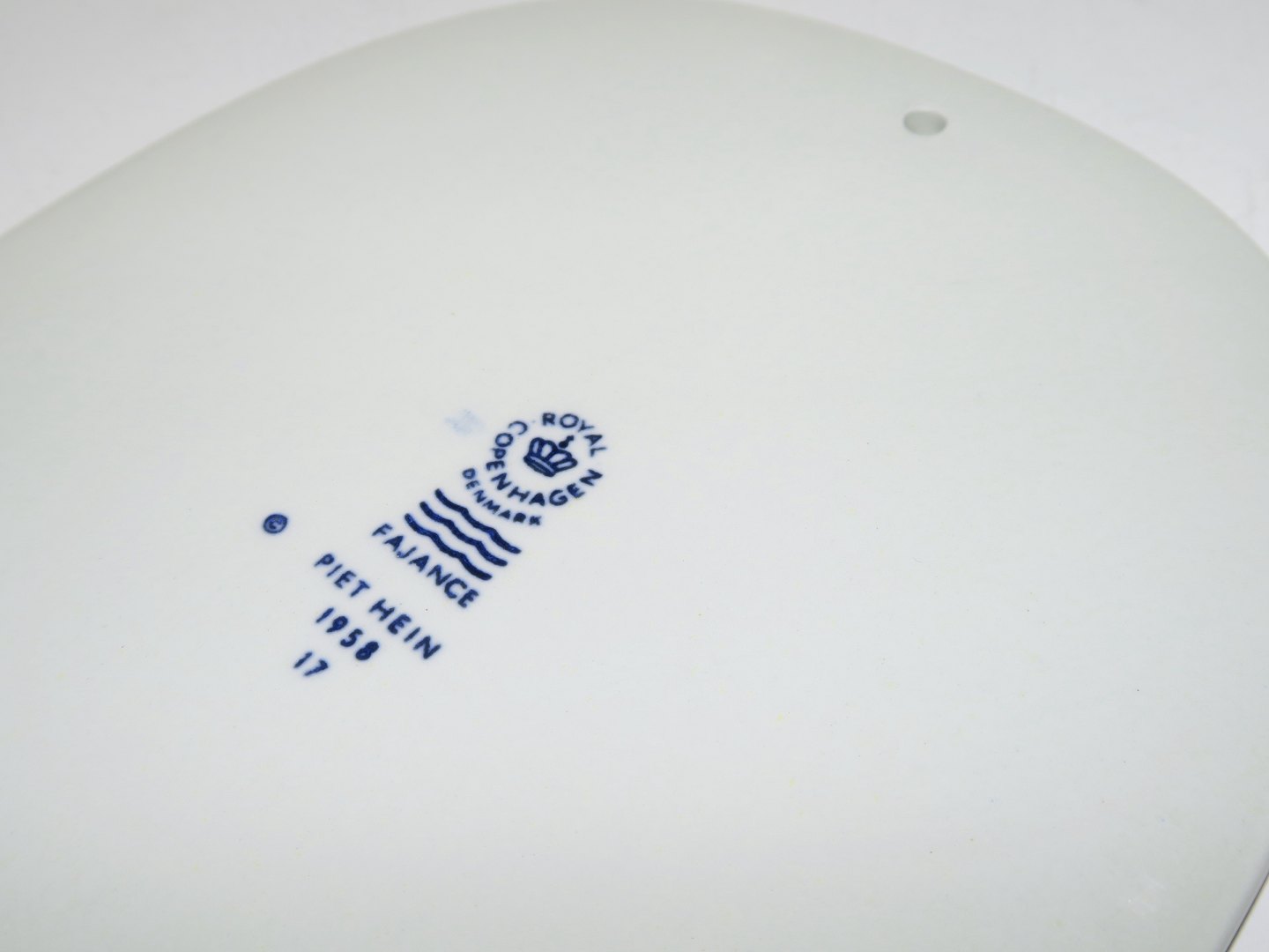 Beskrivelse: Royal Copenhagen Piet Hein platte med gruk på engelsk.