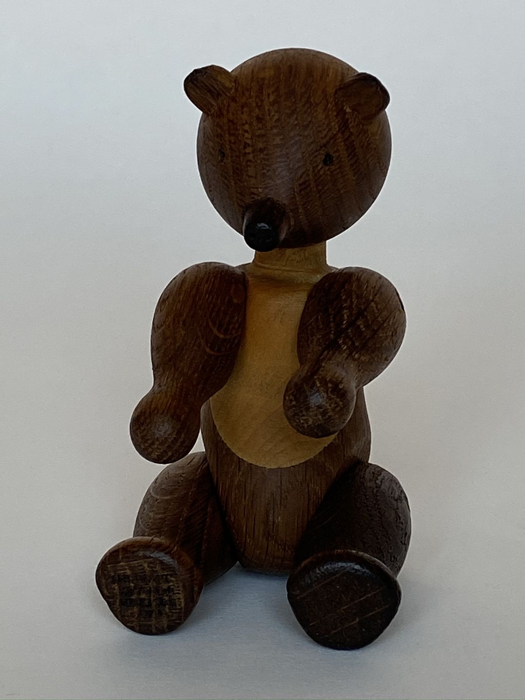 Beskrivelse: Kay Bojesen gammel bjørne figur i eg og ahorn træ. Højde 12,5 cm. Stemplet Kay Bojesen Denmark Copyright. Design af Kay Bojesen i 1952.