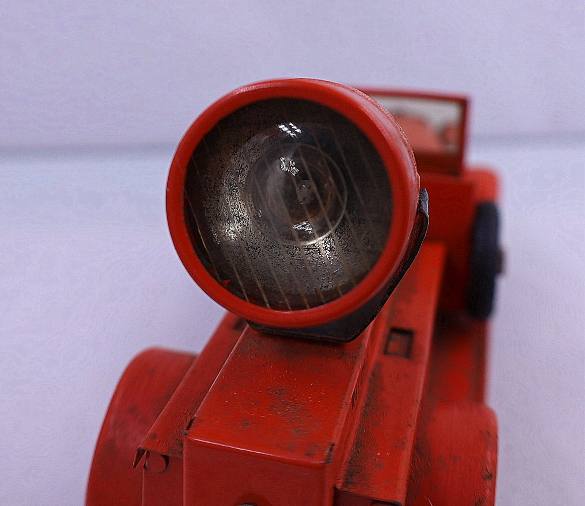 Beskrivelse: Falcks Redningskorps. Lad bil med projektør. Bilen er fra Tekno, Made in Denmark, bilen er lavet af blik. Der er slitage på bilen