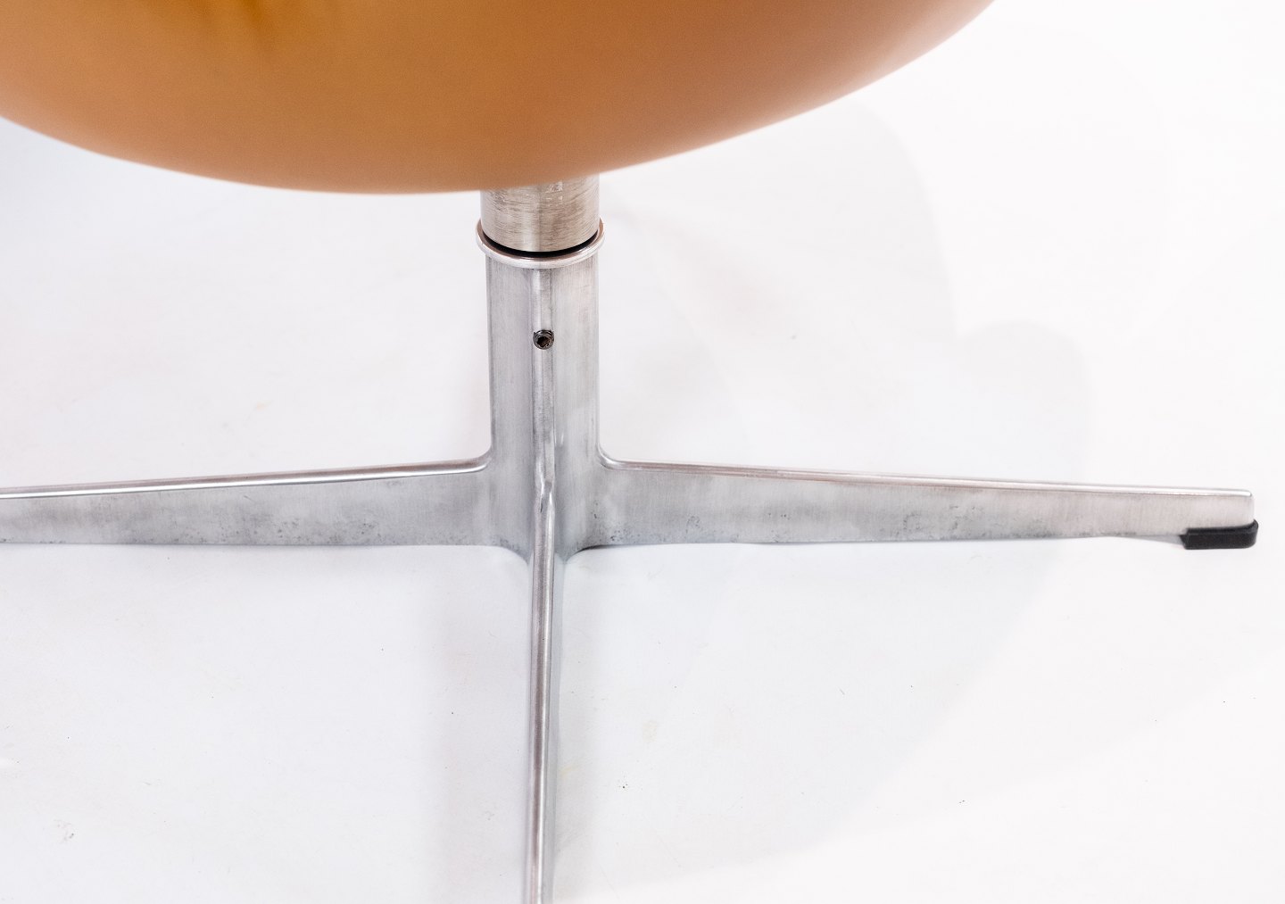 Svanen er drejelig og står på en base af aluminium med en speciel høj søjle, hvilket tilføjer en moderne og stilfuld dimension til designet. Stolens drejefunktion og ergonomiske form gør den ideel til både arbejds- og afslapningsområder, hvor komfort og stil er afgørende.