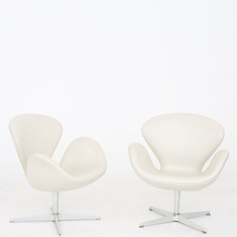 AJ 3320 - 'Svanen' lænestol (jubilæumsmodel) betrukket i hvidt læder med ny fod i perlehvidt metal.