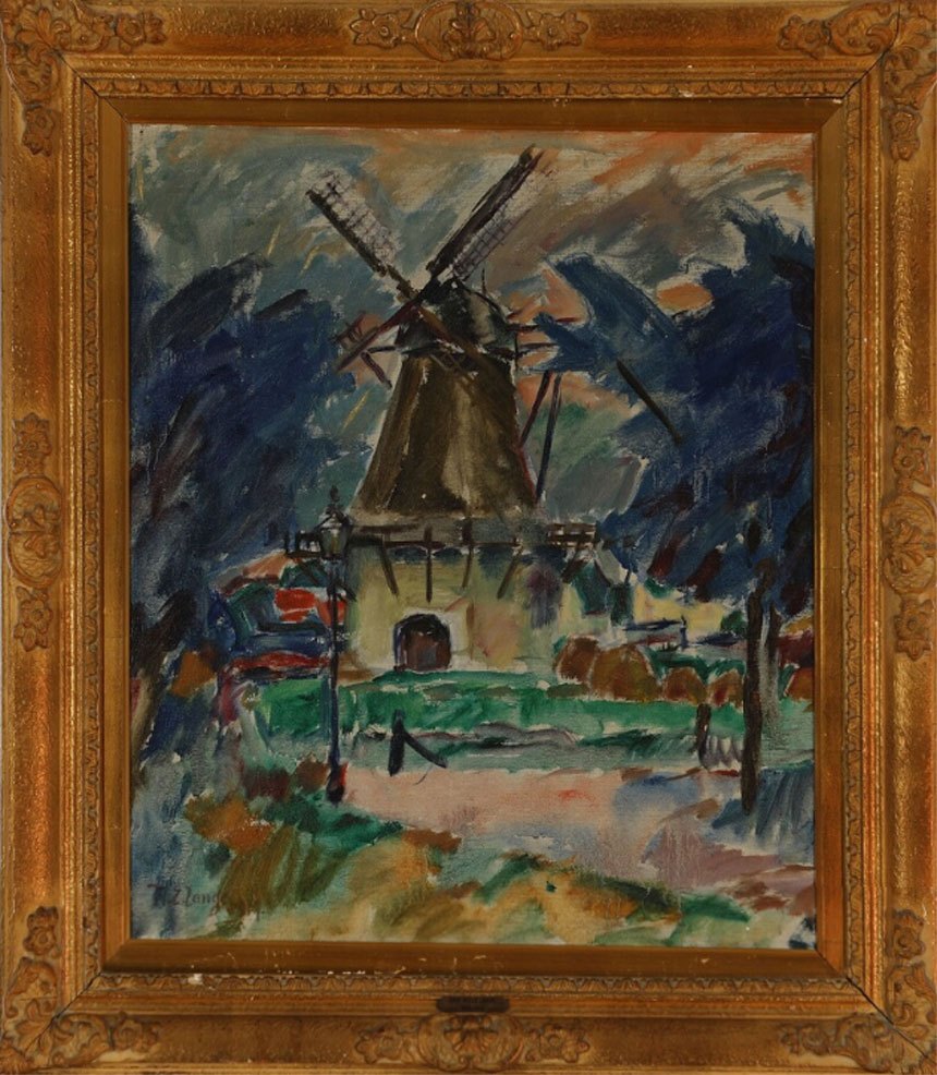 "Landskab med mølle" Olie på lærred i flot ramme.