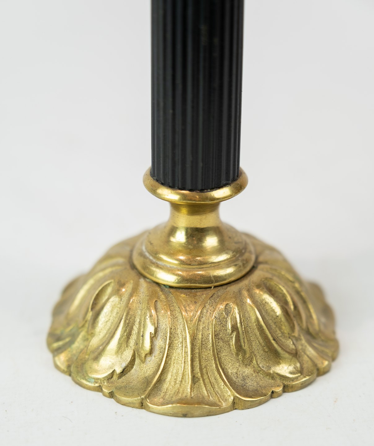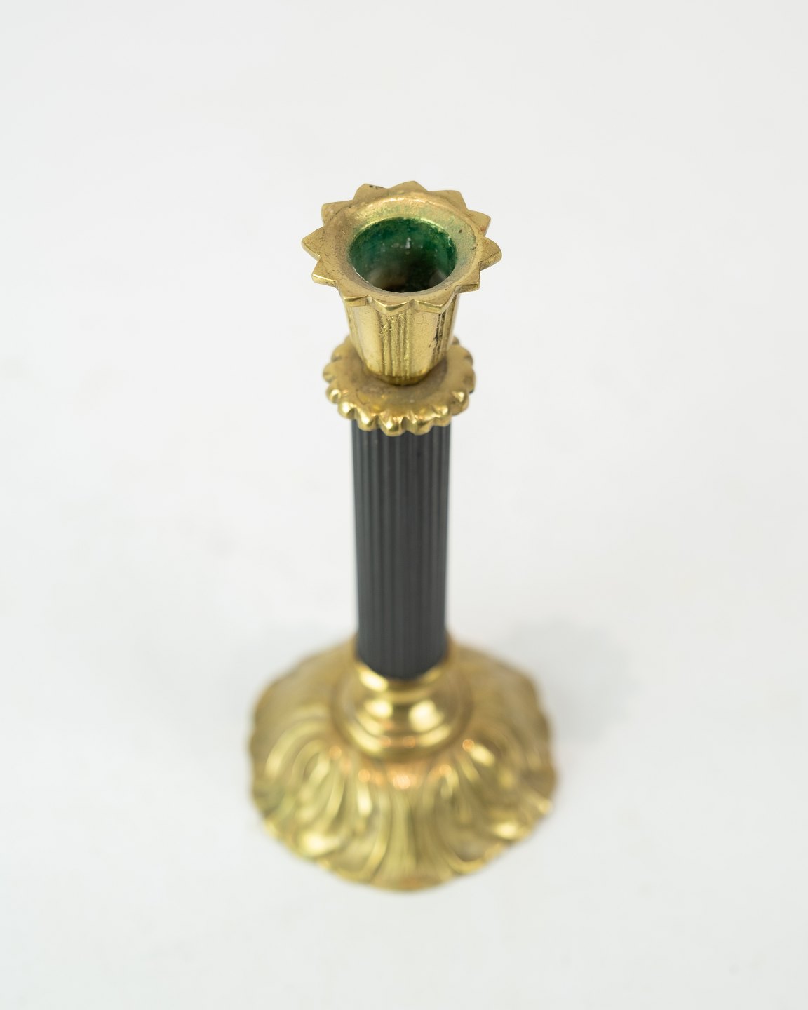 Description: A pair of candlesticks of brass with black metal, in used condition from the 1920s.