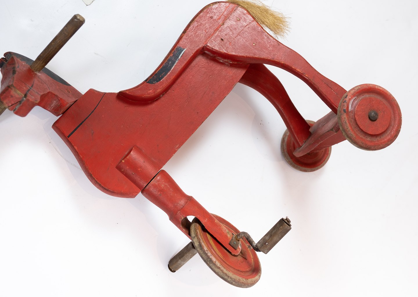 Beskrivelse: Antik trehjulet cykelhest i rød farve fra 1930erne.