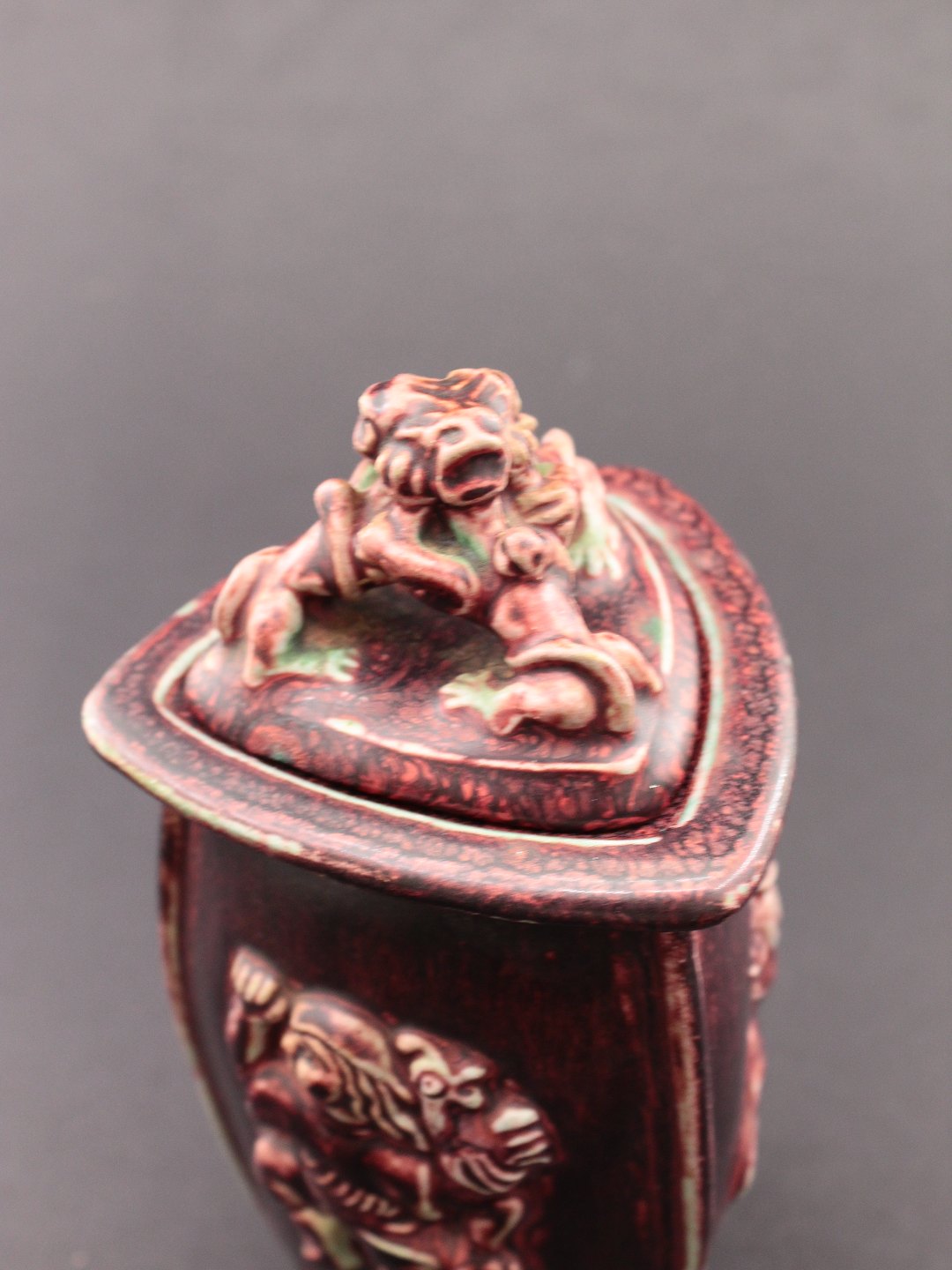 Royal Copenhagen triangular vase with lid 20160 with dark red oxblood glaze