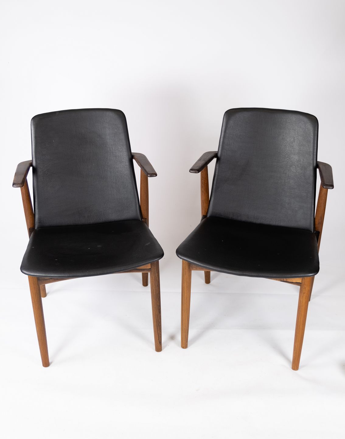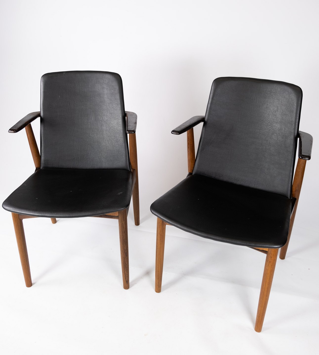 Beskrivelse: Dette par armstole i klassisk sort læder og teak, designet af Hans Olsen fra 1960'erne, udstråler en tidløs elegance og enestående håndværk. Stolene er ikke kun funktionelle, men også et smukt eksempel på dansk designarv, der vil tilføre enhver indretning en sofistikeret og stilfuld atmosfære.
