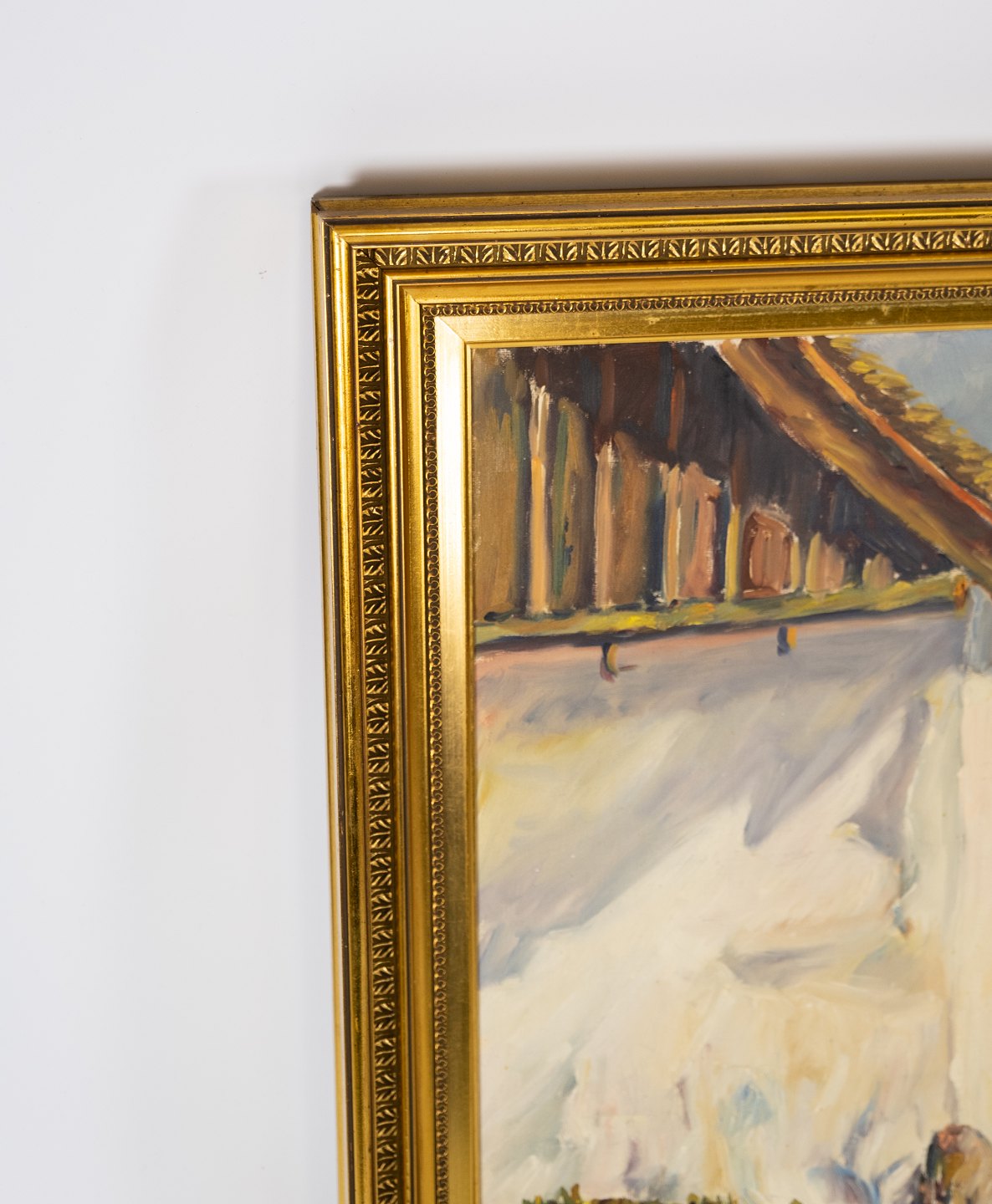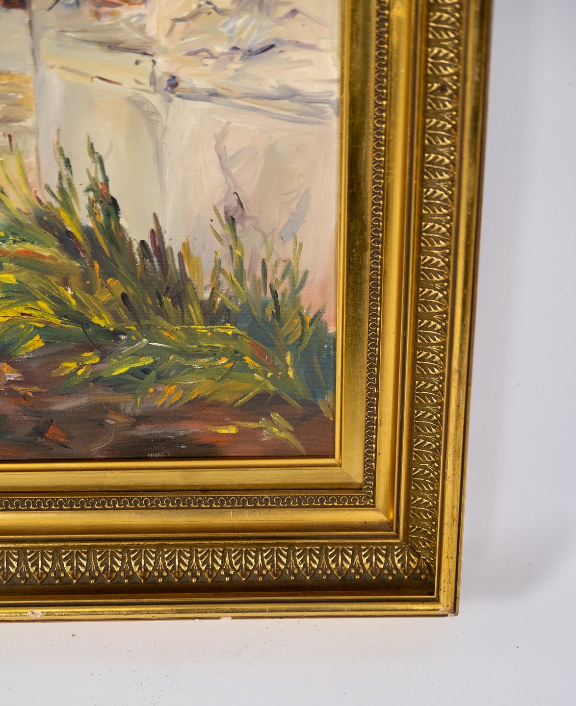 Oliemaleri med land motiv med guldramme signeret P.C.