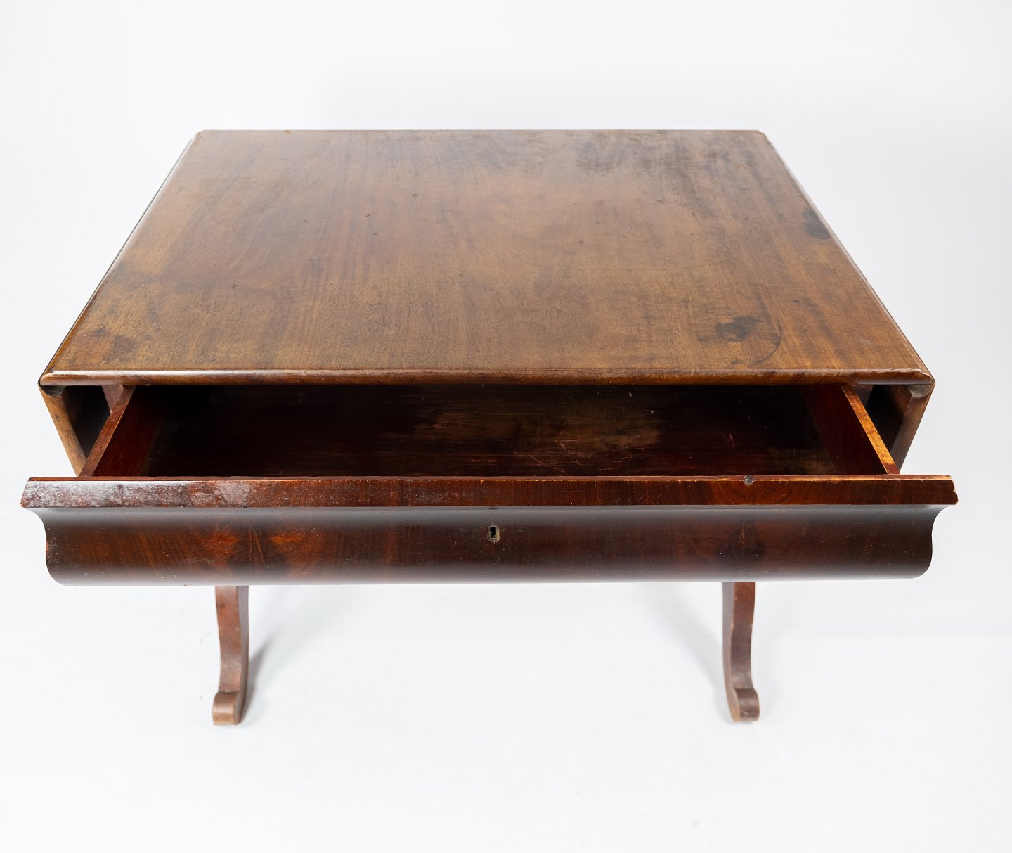 Beskrivelse: Antikt skrivebord af mahogni med skuffe og klapper fra 1860. Bordet er i flot stand.