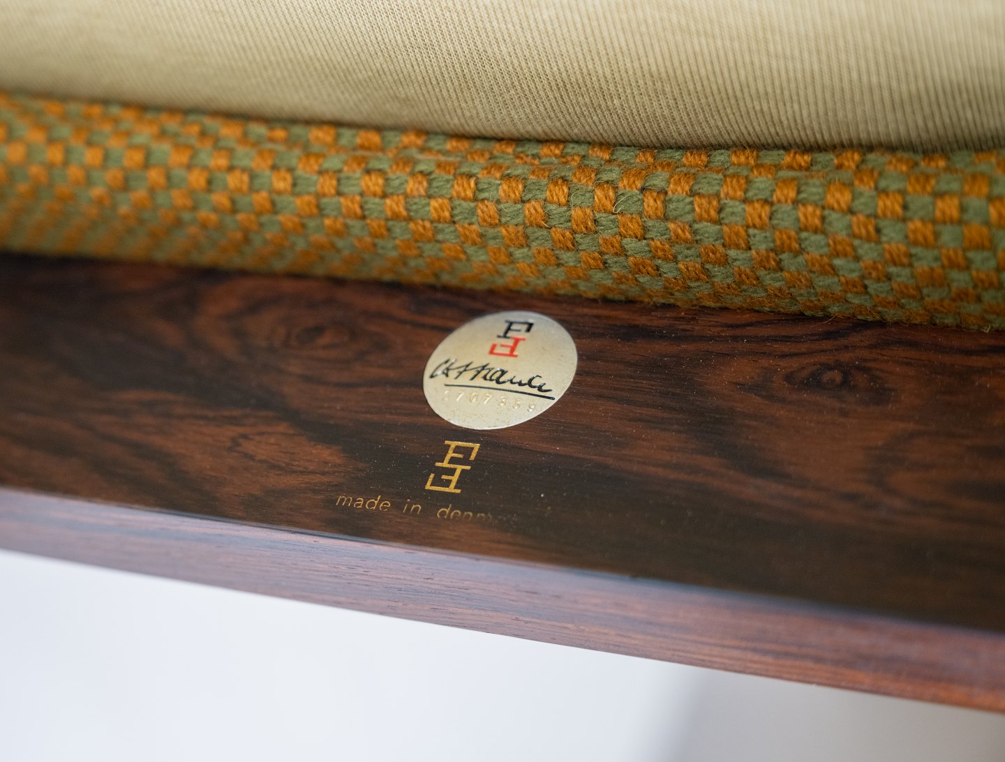 Fremstillet af France & Søn, en anerkendt dansk møbelproducent, er disse stole i flot brugt stand, hvilket vidner om deres holdbarhed og tidløse design. Med deres smukke palisandertræ og det dybe mørkegrønne stof vil disse stole være et elegant og stilfuldt tilføjelse til enhver stue eller læsehjørne.