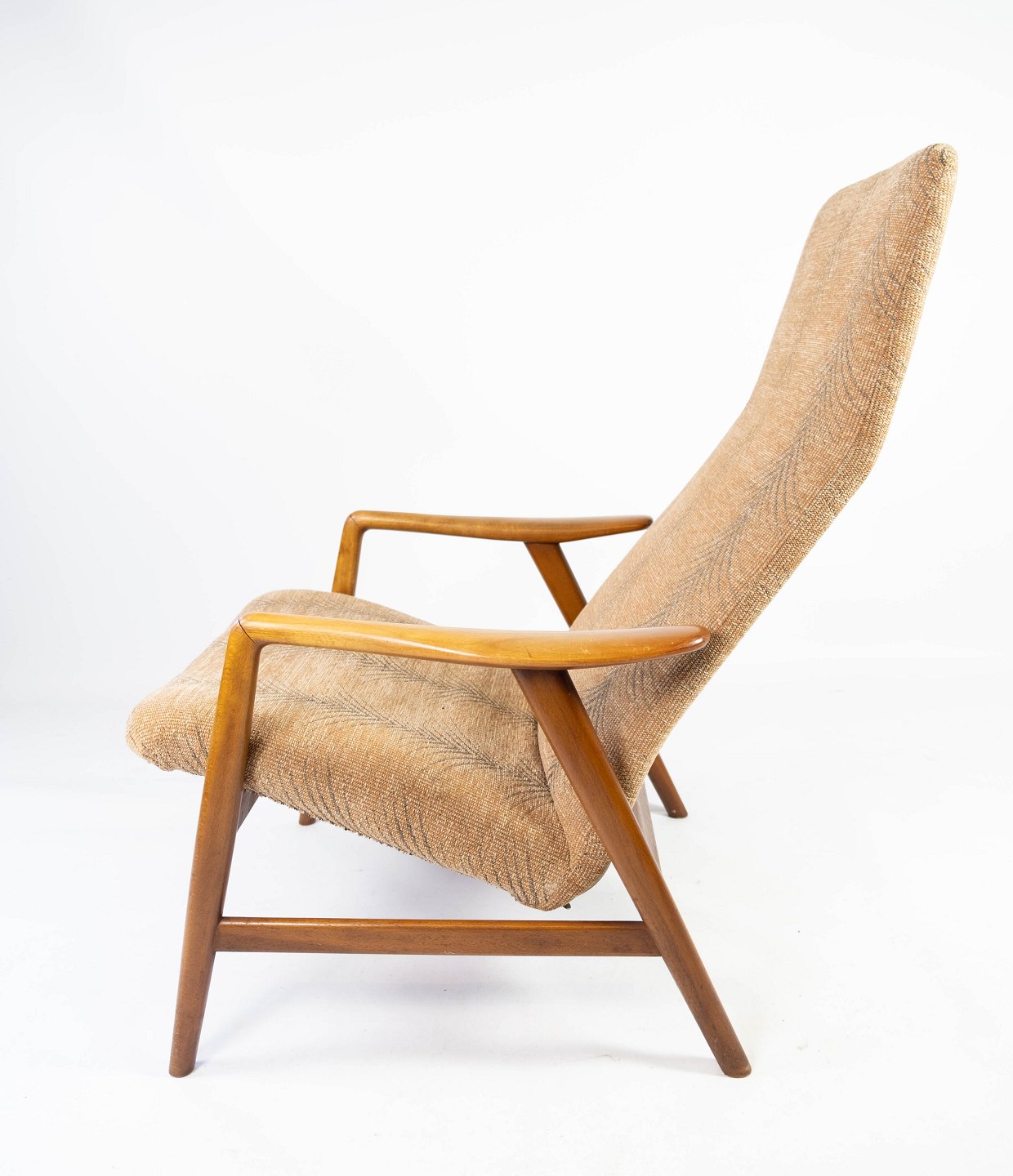Beskrivelse: Hvilestol designet af Alf Svensson og fremstillet af Fritz Hansen i 1960erne. Stolen er i teak og polstret med lyst stof.