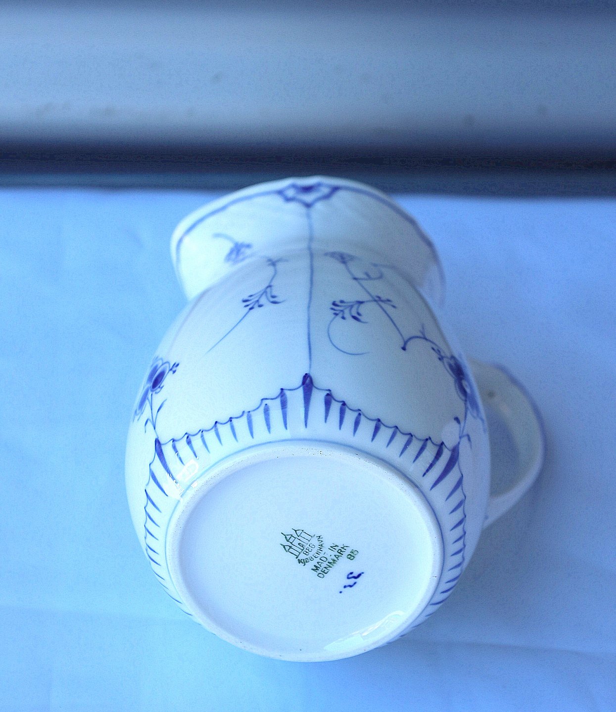 Beskrivelse: Bing & Grøndahl, musselmalet kande nr. 85. Kanden er hvidt porcelæn, med blåmalet mønster.