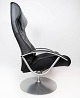 Lænestol med skammel polstret i sort læder og stel af metal, af Dansk design fra 1970erne.