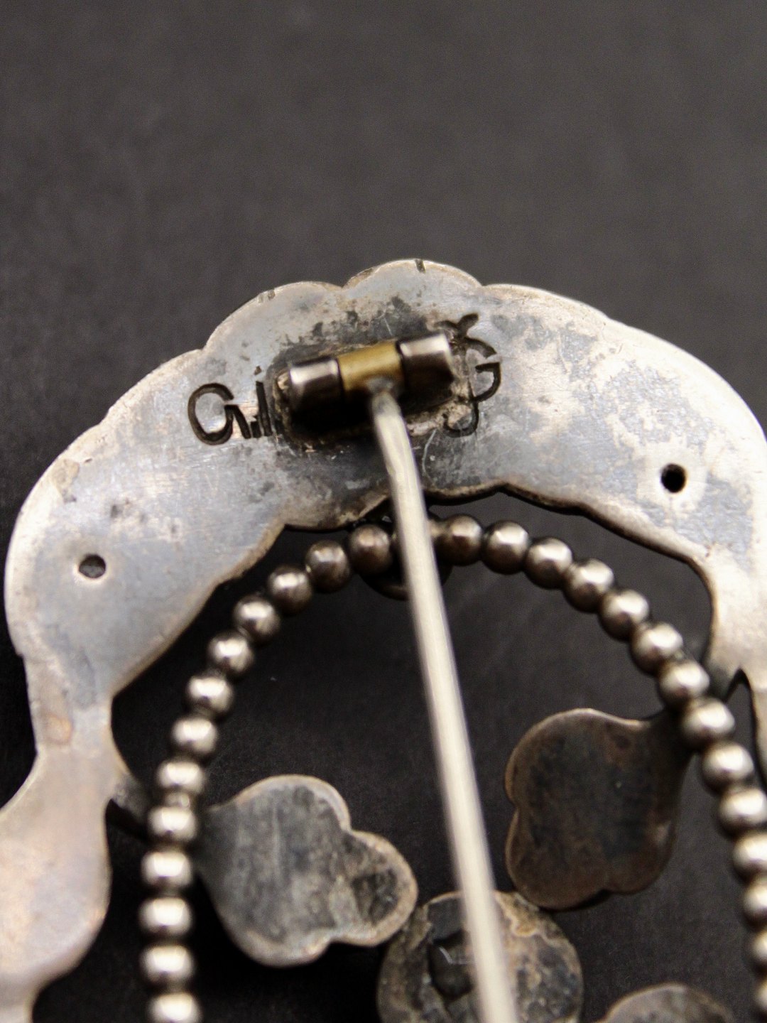 Beskrivelse: Georg Jensen broche 3,9 x 5,5 cm. med månesten og labradoriter designet af Georg Jensen stempel 1909-14 emne nr. 462512