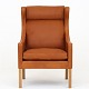 BM 2204 - Rephosltered Wing-back chair in Klassik Cognac leather with legs in oak.