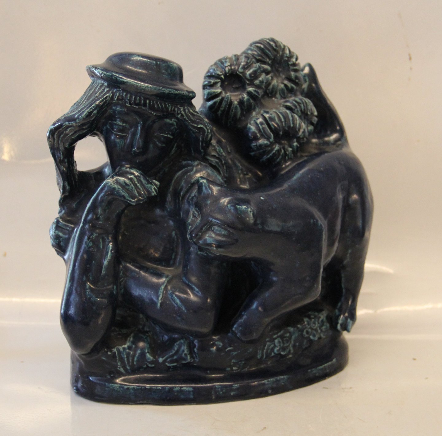 Beskrivelse: Unika Blåglaseret Stentøj Pige med kat 26 x 27 cm Helge Christoffersen Royal Copenhagen stentøj I fin og hel stand Signeret HC