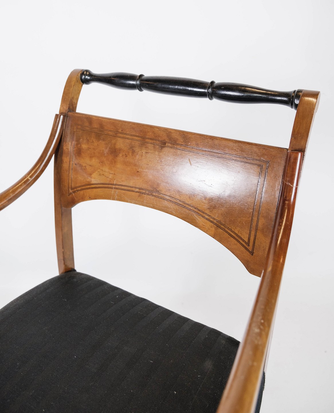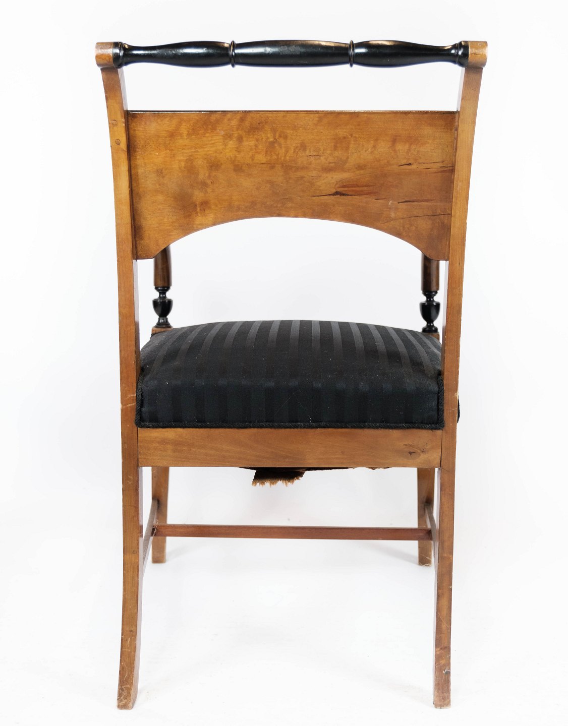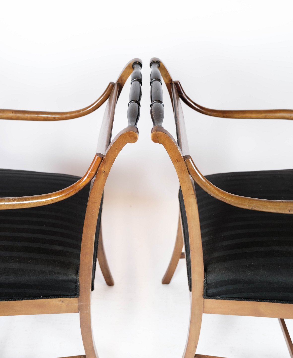 Sæt af to armstole af birketræ og polstret med sort stribet stof, fra 1840erne.