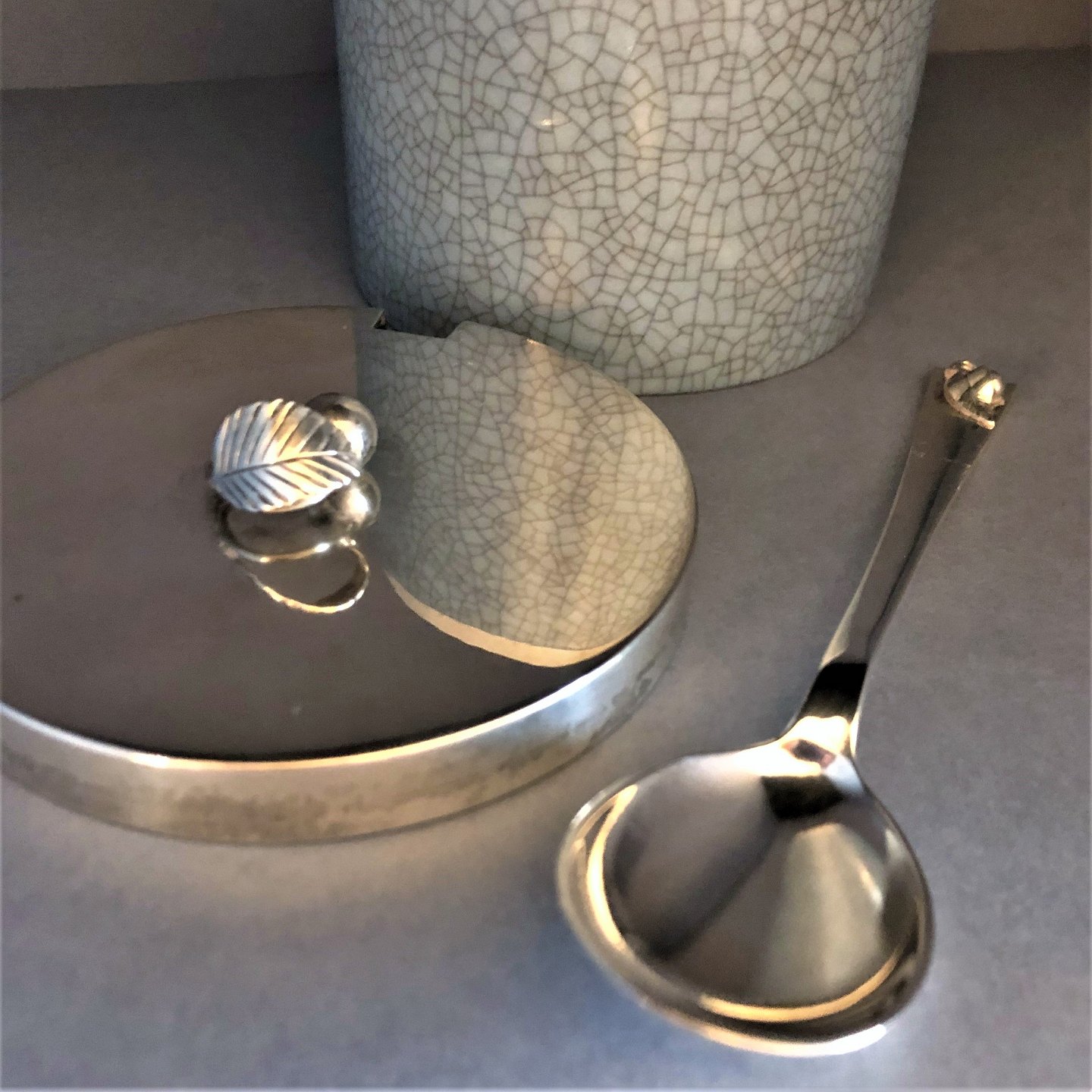Kgl. Porcelæn, Royal Copenhagen; Craquele marmeladekrukke med sølvlåg og ske #3620