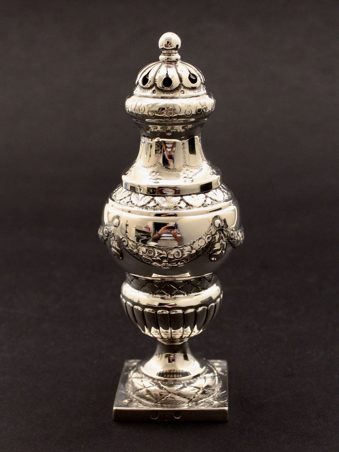 : Tretårnet sølv sukker strøer H. 18 cm. emne nr. 469069