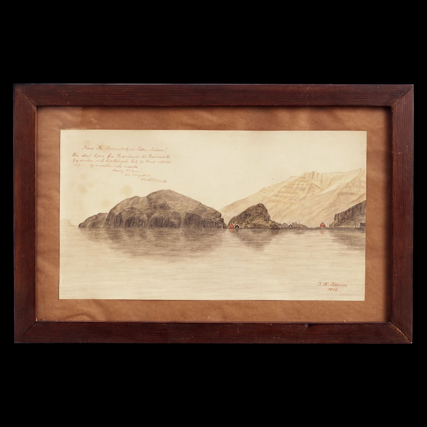Tegning Grønland. Tegning skænket til kolonibestyrer (1912-45) Johs. Nielsen af I. H. Petersen 1945 i anledning Johs. Nielsens hjemrejse. Signeret og dateret 1945. Lysmål: 20x36cm. Med ramme: 31x46cm