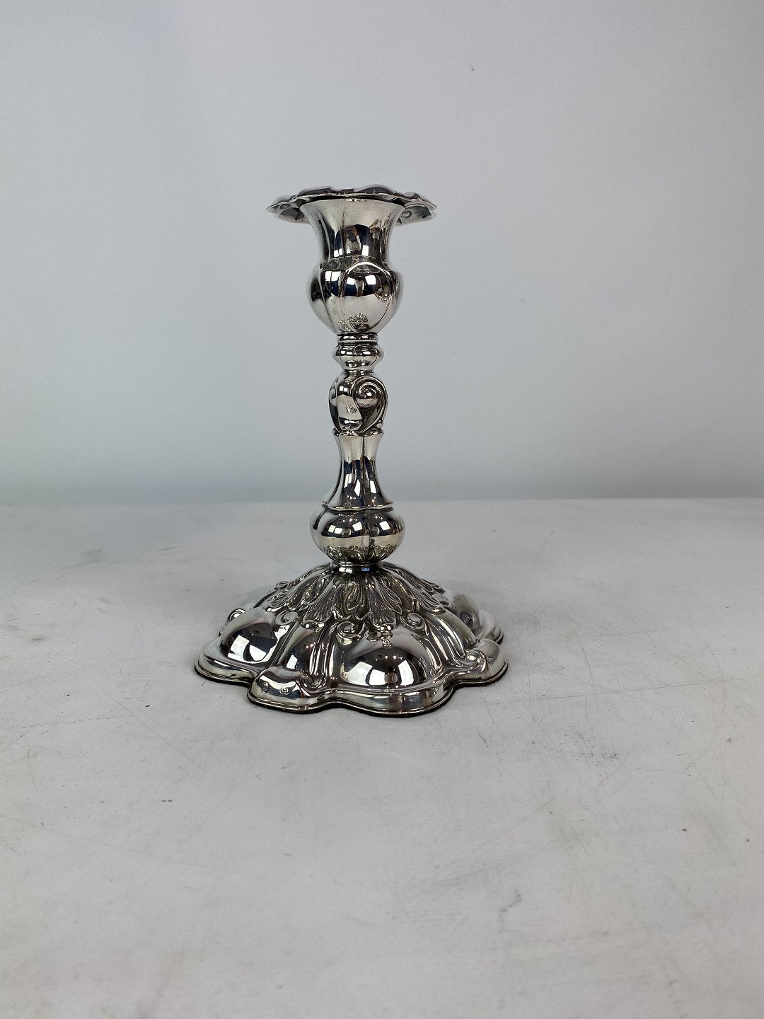 Sæt af to rokoko lysestager af tretårnet sølv, i flot antik stand fra 1920erne.